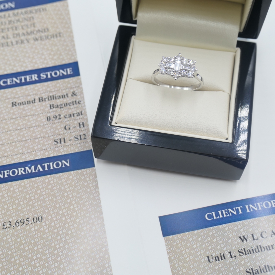 A brand-new, unused certified platinum cluster ring, this refined boat-shaped design brings together elegance and sparkle in perfect harmony. At the centre sit three natural baguette-cut diamonds, admired for their clean lines and understated sophistication, creating a striking focal point. Surrounding them is a halo of natural brilliant-cut diamonds that amplify the design's fire and brilliance, giving the ring a total diamond weight of 0.92ct. Graded G-H in colour and SI1-SI2 in clarity, the stones are chosen for their balance of quality and beauty, perfectly complemented by the strength and cool sheen of platinum.
