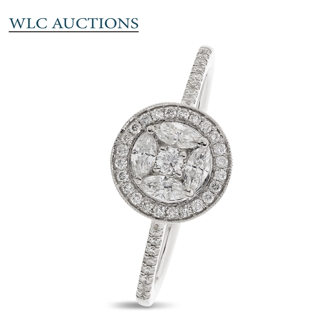 A brand-new, unused, certified natural diamond brilliant-shaped cluster ring set with a cluster of marquise-cut and brilliant-cut diamonds to the centre & a cluster of brilliant-cut diamonds to the shoulders, set in 18ct white gold.