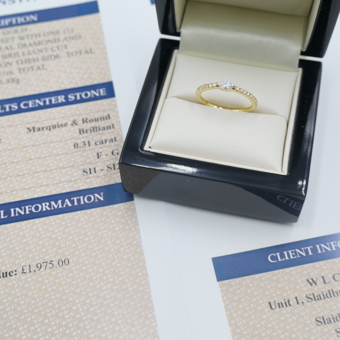 A brand-new, unused certified natural diamond cluster ring that beautifully combines refined elegance with timeless charm. At its centre sits a graceful marquise-cut natural diamond, enhanced by a delicate cluster of brilliant-cut diamonds intricately set within the band. Together, the diamonds total 0.31ct and are graded F–G in colour and SI1–SI2 in clarity, offering a bright, balanced sparkle that captures the light from every angle. Crafted in 18ct yellow gold, the warm metal enhances the diamonds’ radiance and lends a luxurious, vintage-inspired appeal. With a total weight of 1.88 grams and a professional valuation of £1,975, this ring exemplifies both fine craftsmanship and understated sophistication.