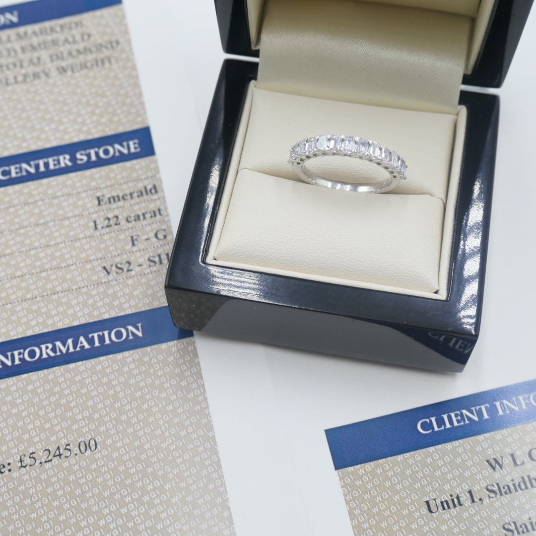 A brand-new, unused certified natural diamond cluster ring that radiates refined sophistication and timeless elegance. This exquisite piece is set with a striking cluster of emerald-cut natural diamonds totalling 1.22ct, meticulously arranged to create a captivating display of brilliance and symmetry. Each diamond is graded F–G in colour and VS2–SI1 in clarity, offering exceptional purity and sparkle with a graceful geometric allure. Expertly crafted in platinum, a metal celebrated for its strength, rarity and enduring lustre, the setting enhances the diamonds’ cool luminosity while ensuring lifelong durability. With a total weight of 4.22 grams and a professional valuation of £5,245, this ring stands as a true reflection of superior craftsmanship and luxury.