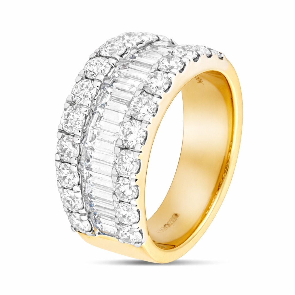 A brand-new, unused certified 18ct yellow and white gold cluster ring, this impressive jewel is set with a striking combination of brilliant-cut and baguette-cut natural diamonds weighing a total of 2.88ct. Weighing 10.34 grams. Carefully matched in SI2 clarity and G–H colour, the diamonds create a bold arrangement that captures the light from every angle, blending sparkle with sleek geometry. The contrast of yellow and white gold enhances the play of brilliance and fire, offering both warmth and brightness in a design that is substantial yet refined. With its generous carat weight and distinctive styling, this ring is crafted to make a statement of elegance and luxury.