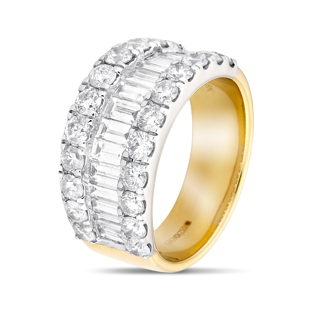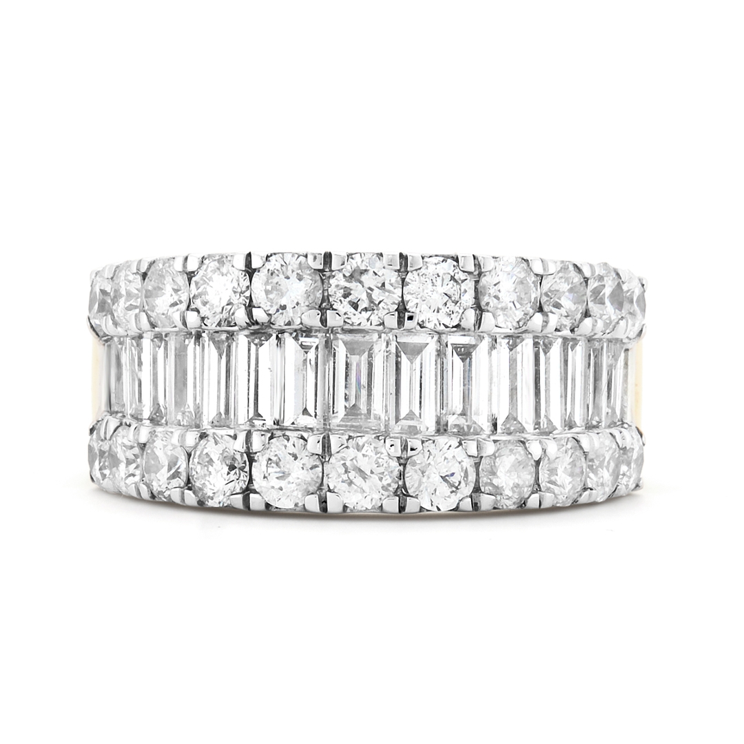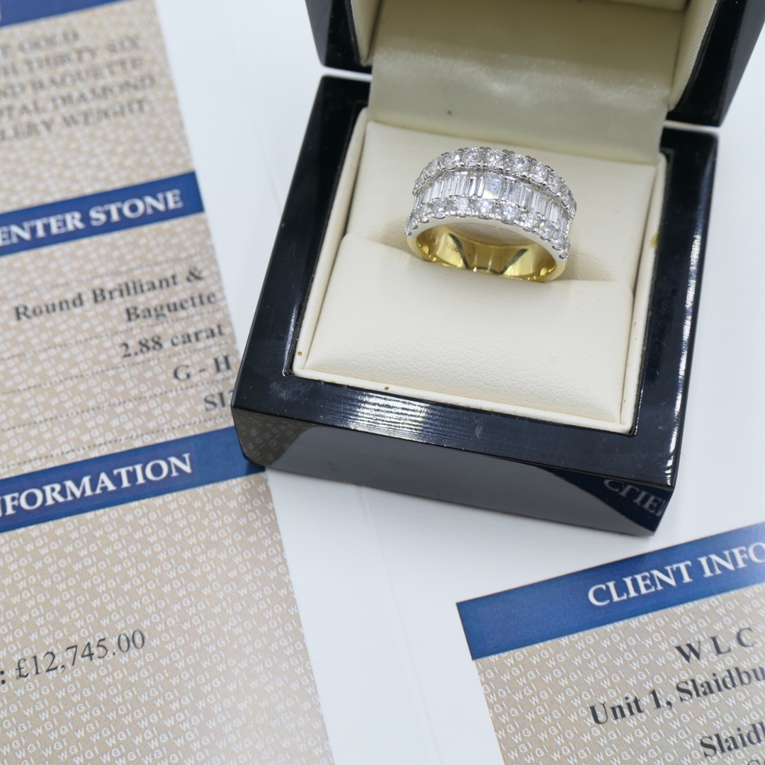 A brand-new, unused certified 18ct yellow and white gold cluster ring, this impressive jewel is set with a striking combination of brilliant-cut and baguette-cut natural diamonds weighing a total of 2.88ct. Carefully matched in SI2 clarity and G–H colour, the diamonds create a bold arrangement that captures the light from every angle, blending sparkle with sleek geometry. The contrast of yellow and white gold enhances the play of brilliance and fire, offering both warmth and brightness in a design that is substantial yet refined. With its generous carat weight and distinctive styling, this ring is crafted to make a statement of elegance and luxury.