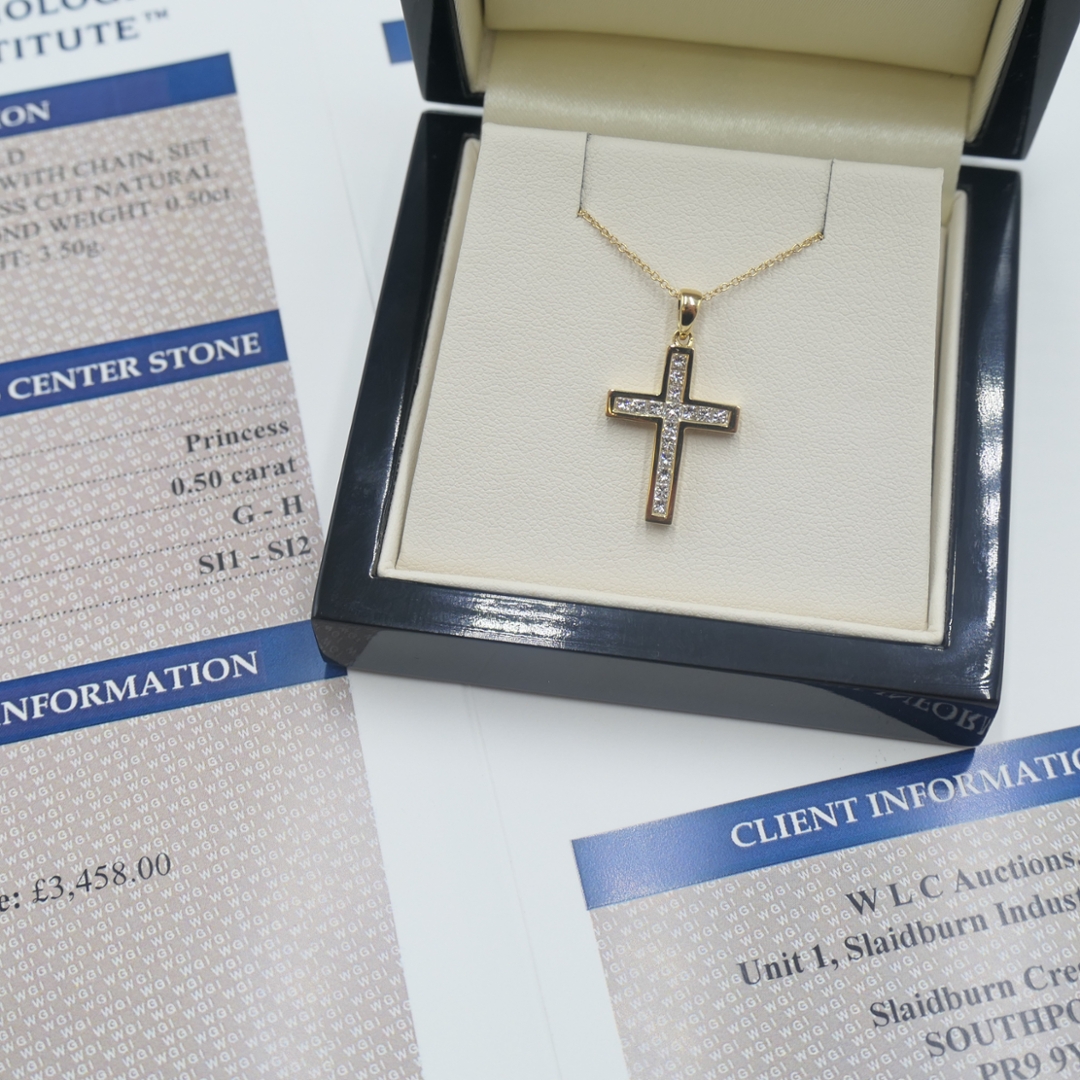 A brand-new, unused certified natural diamond cross pendant that embodies faith, elegance, and timeless craftsmanship. This exquisite piece is set with a cluster of princess-cut natural diamonds, together weighing 0.50 carats. Each diamond, graded G–H in colour and SI1–SI2 in clarity, reflects exceptional sparkle and precision. The princess cuts offer a modern geometric brilliance, their sharp facets catching light beautifully to create a stunning display of fire and clarity. The arrangement of diamonds forms a perfectly balanced cross, symbolising devotion and enduring grace.