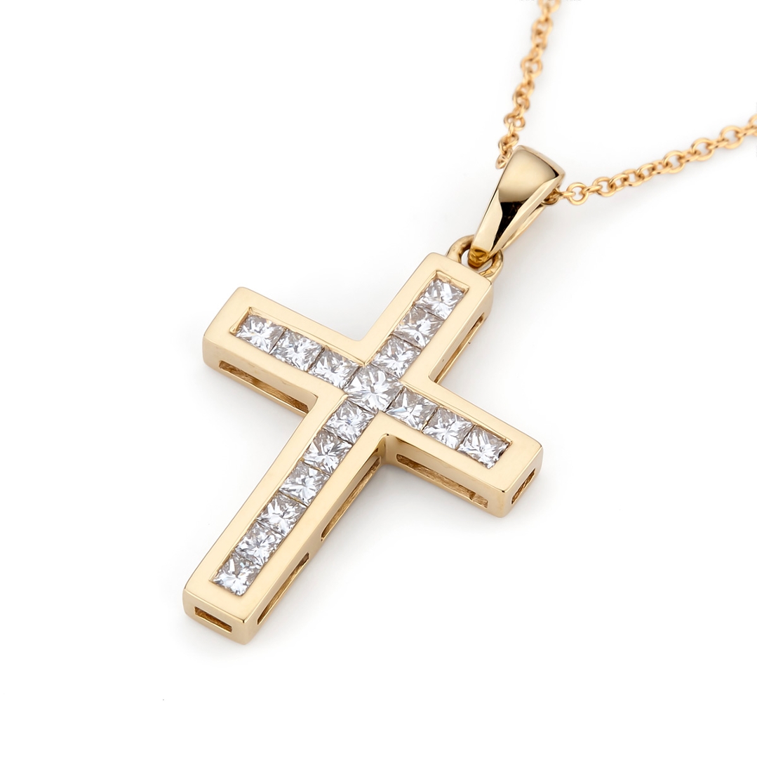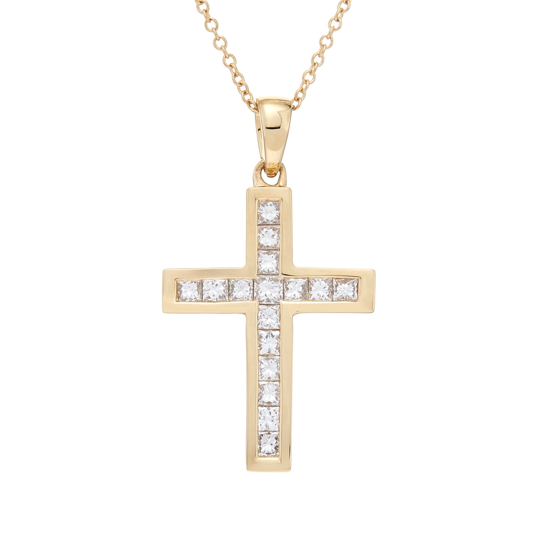 A brand new, unused, certified natural diamond cross pendant, set with a cluster of princess cut diamonds, set in 18ct yellow gold.