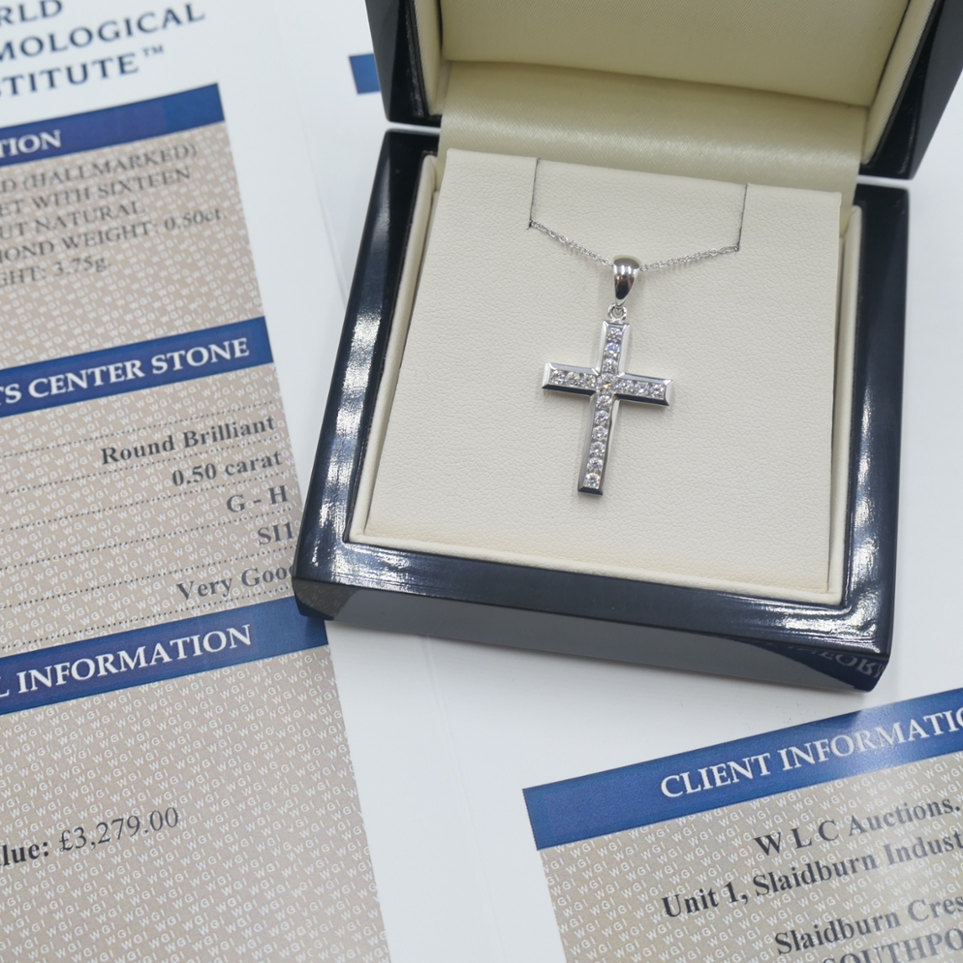 A brand-new, unused certified 18ct white gold cross pendant, crafted to highlight the timeless brilliance of natural diamonds. This elegant piece features a refined cluster of brilliant cut diamonds with a total weight of 0.50ct, offering SI1 clarity and a bright G–H colour that catches the light with effortless sparkle. The round cuts lend a soft, classic radiance that contrasts beautifully against the sleek, cool tones of the white gold setting. Suspended from an 18-inch chain, the pendant sits gracefully at the neckline, offering a graceful and meaningful touch to any ensemble.