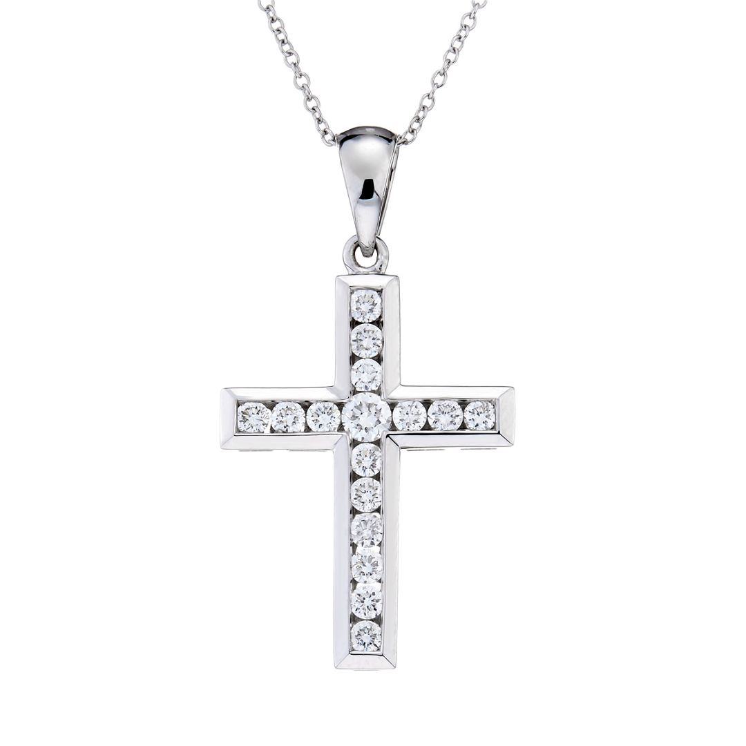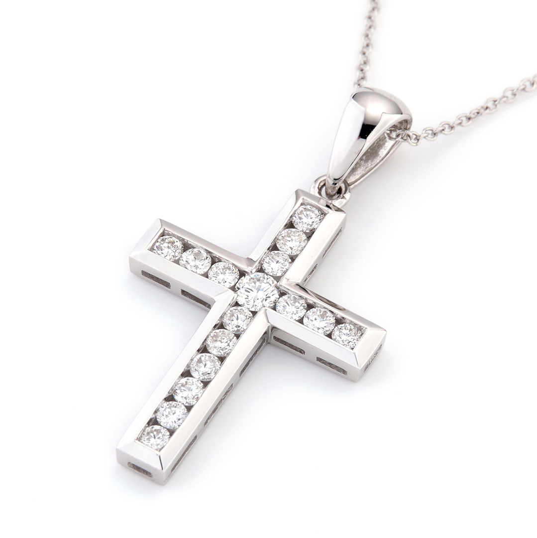 A brand new, unused, certified 18ct white gold natural diamond cross pendant, set with a cluster of brilliant cut diamonds.