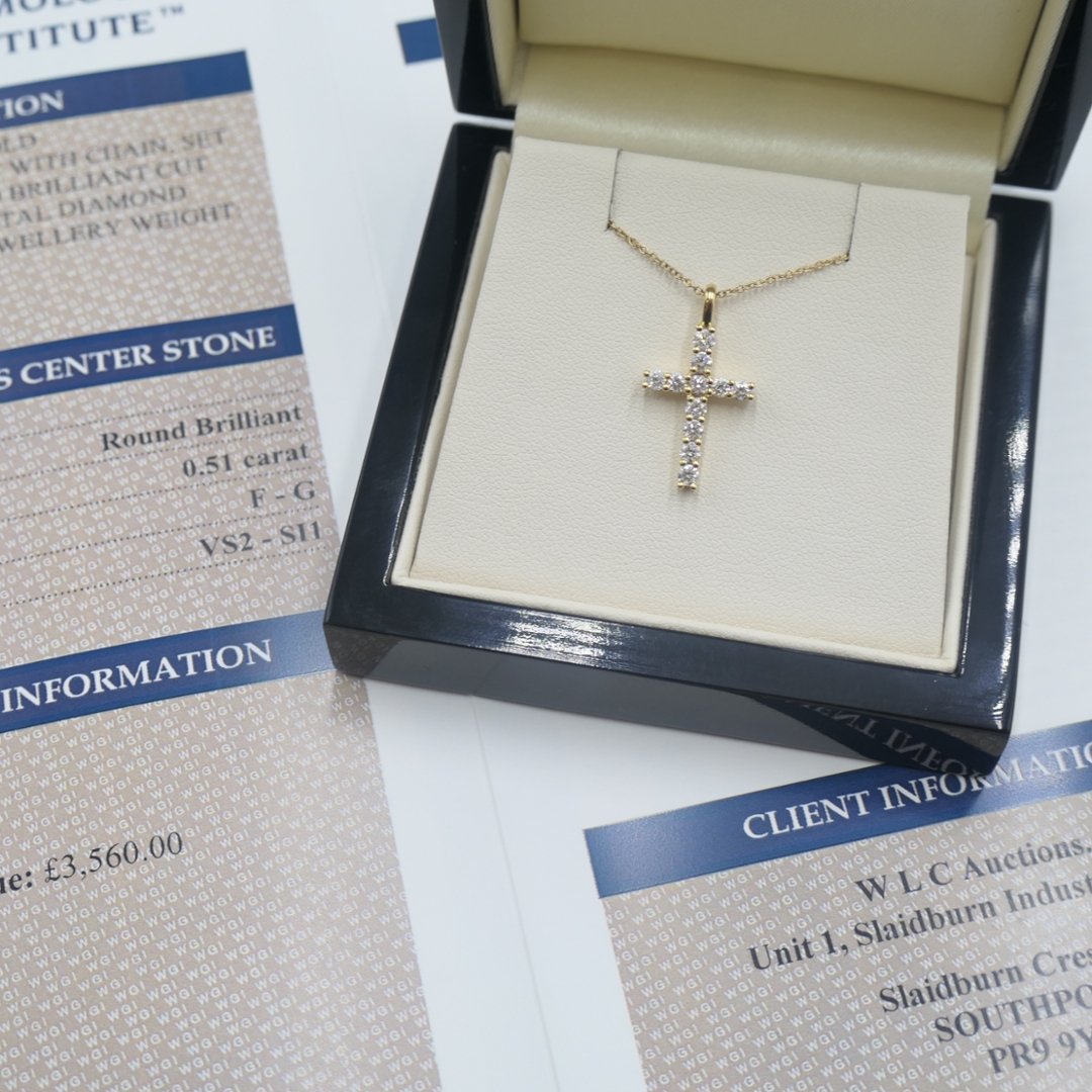 A brand-new, unused certified natural diamond cross pendant that radiates elegance and timeless devotion. This exquisite piece is set with a cluster of brilliant-cut natural diamonds, totalling 0.51 carats, each carefully chosen for its fine quality and captivating sparkle. The diamonds, graded F–G in colour and VS2–SI1 in clarity, display exceptional fire and luminosity, enhancing the cross design with a refined brilliance that catches the light beautifully. The result is a pendant that perfectly balances spiritual symbolism with luxurious style.