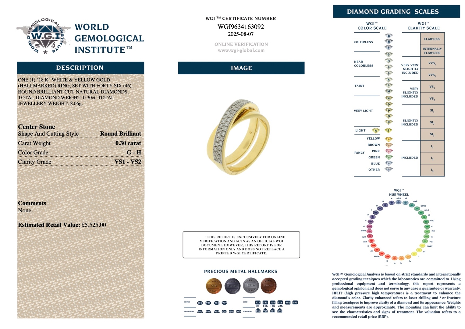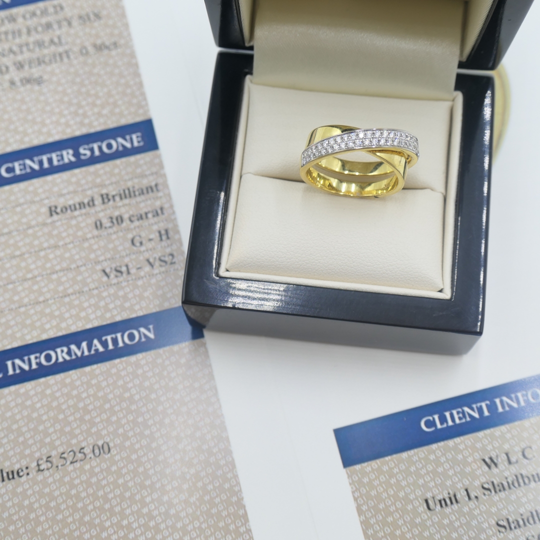 A brand-new, unused, certified 18ct white and yellow gold cluster ring, this elegant crossover design is set with a cluster of natural brilliant-cut diamonds totalling 0.30ct. Graded G-H in colour with VS1-VS2 clarity, the stones were selected for their crisp sparkle and fine quality, producing a lively play of light across the setting. The crossover shape gives the ring a graceful flow, while the blend of white and yellow gold enhances the diamonds’ natural radiance with both contrast and warmth. This balance of design and detail ensures a refined piece of jewellery that is both versatile and timeless.