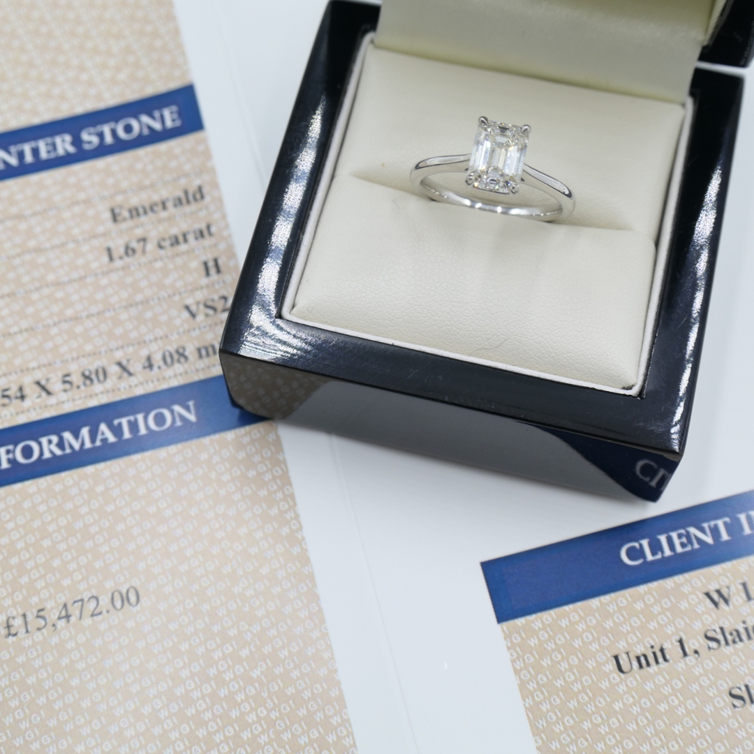 A brand-new, unused, certified natural diamond solitaire engagement ring, this exceptional piece embodies timeless elegance and refined luxury. At its centre rests a stunning 1.67-carat emerald-cut natural diamond, graded H in colour and VS2 in clarity. The emerald cut, celebrated for its clean lines and hall-of-mirrors effect, highlights the diamond’s remarkable clarity and sophistication. Its elongated shape exudes a graceful brilliance, radiating understated glamour and capturing light in a refined, mesmerising way.