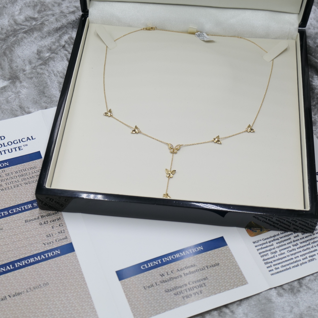 A brand-new, unused certified natural diamond chain necklace that captures elegance, femininity, and timeless beauty in a graceful butterfly droplet design. This exquisite piece features a cluster of brilliant-cut natural diamonds, totalling 0.42 carats, delicately arranged to create a soft shimmer that dances in the light. Graded F–G in colour and SI1–SI2 in clarity, the diamonds display exceptional brilliance and purity, each one carefully selected for its natural sparkle and authenticity. The intricate butterfly motif adds a touch of charm and symbolism, representing transformation, grace, and renewal — a perfect fusion of artistry and nature’s beauty.