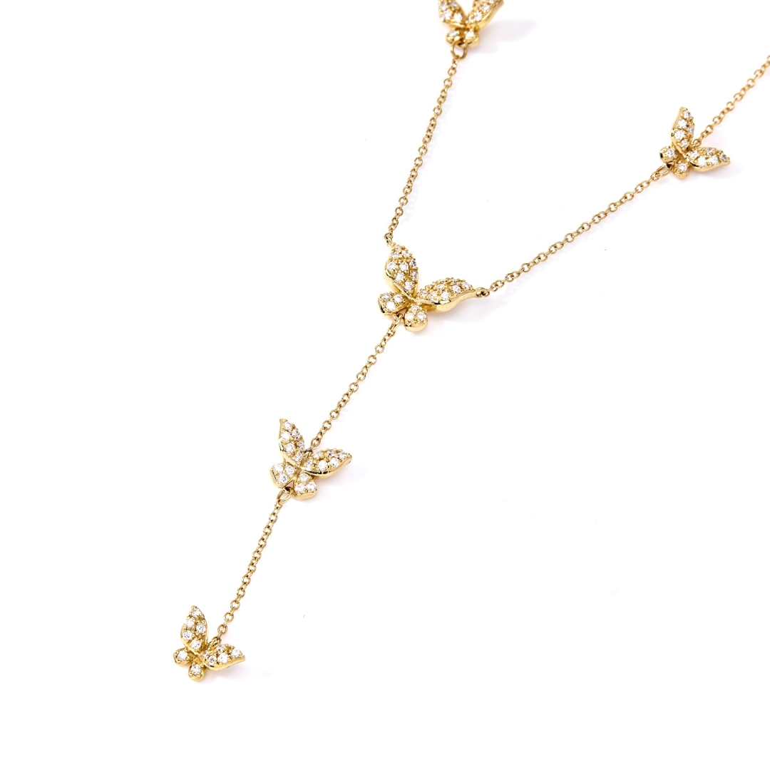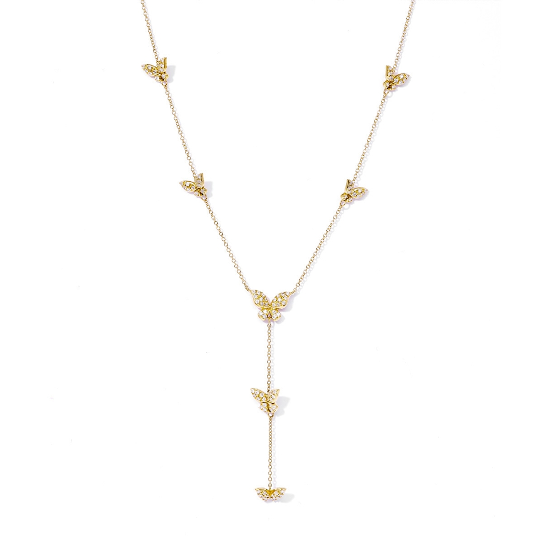 A brand-new, unused, certified natural diamond chain necklace in a butterfly droplet design, with a cluster of brilliant-cut diamonds set in 18ct yellow gold.