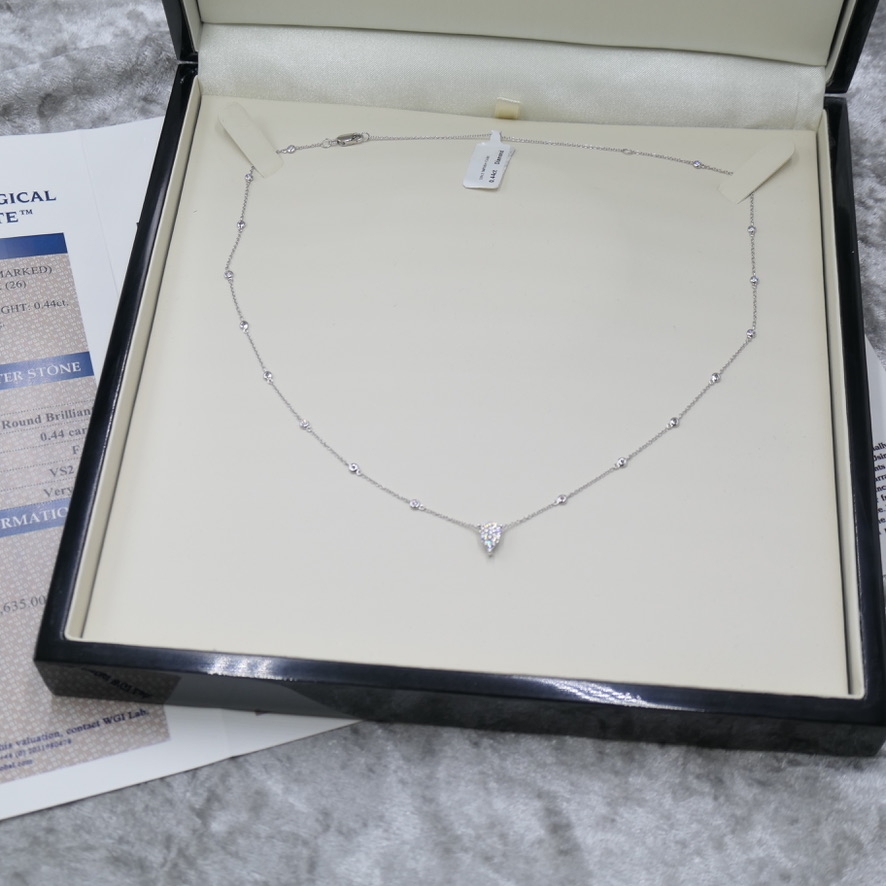 A brand-new, unused certified natural diamond chain necklace that embodies sophistication and timeless grace. Designed in an elegant pear-shaped motif, this stunning piece is set with a cluster of brilliant-cut diamonds totalling 0.44 carats. The diamonds, graded F–G in colour and VS2–SI1 in clarity, exhibit exceptional brilliance and fire, reflecting light beautifully from every angle. Their perfectly matched sparkle captures the eye with refined radiance, making this necklace a luxurious and versatile adornment for any occasion.