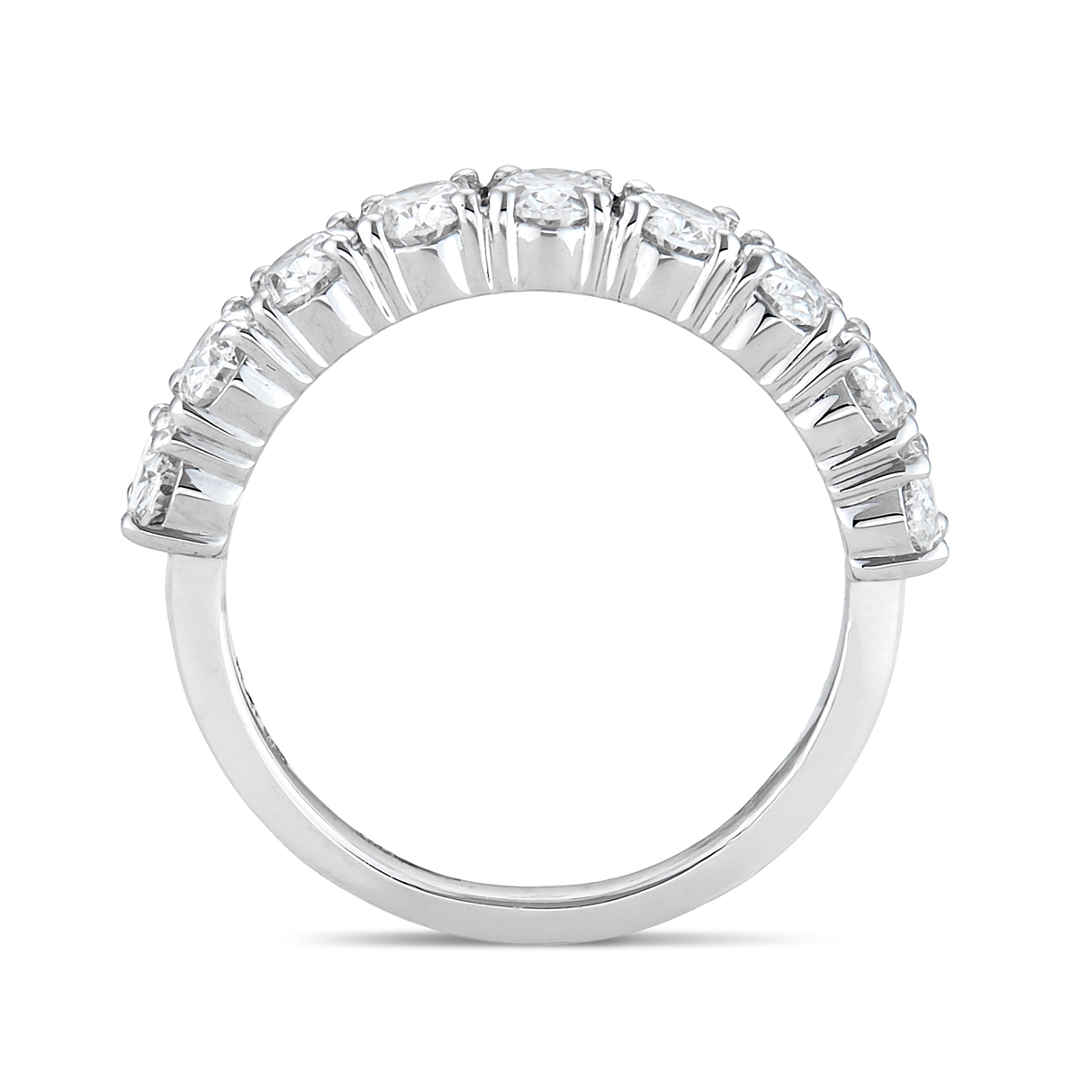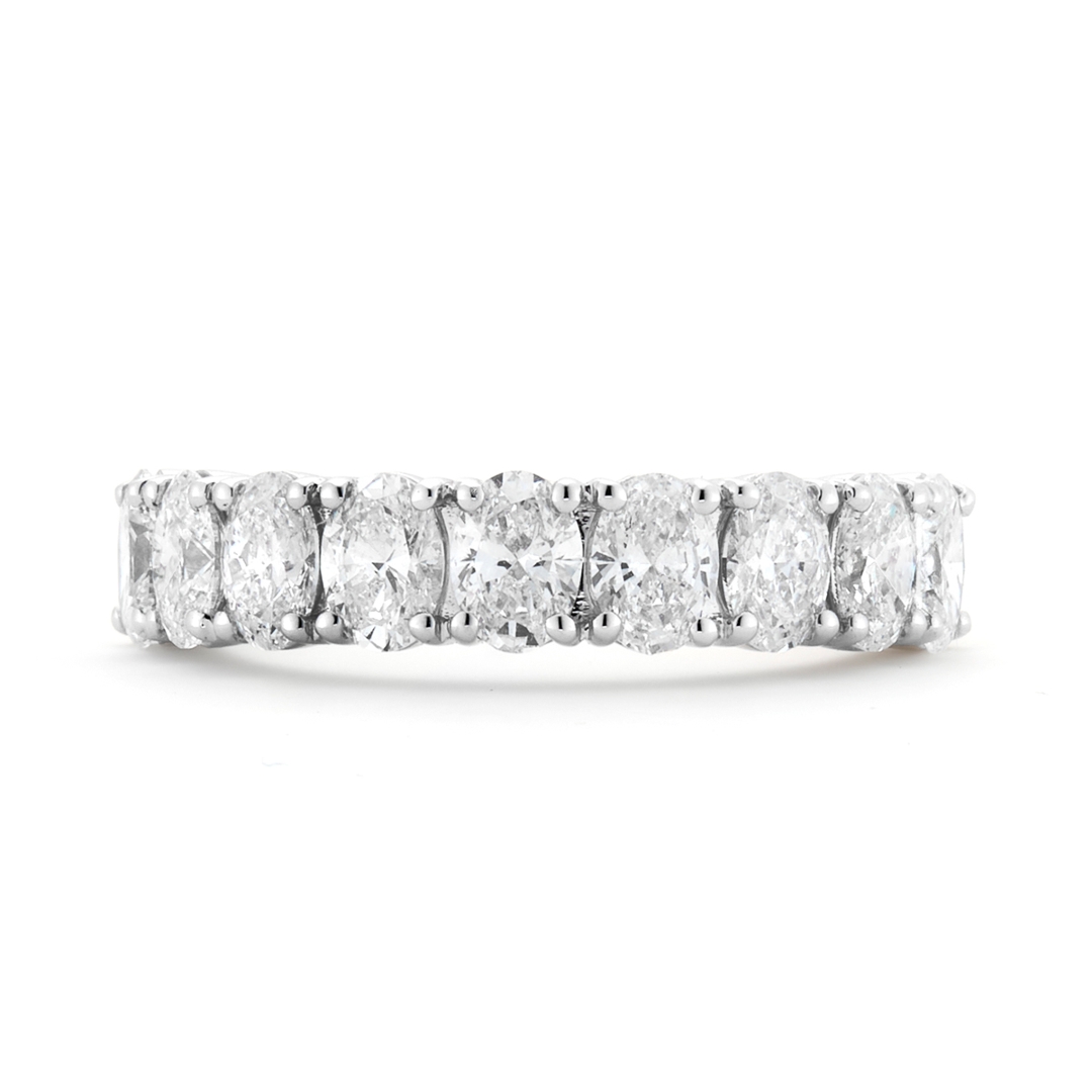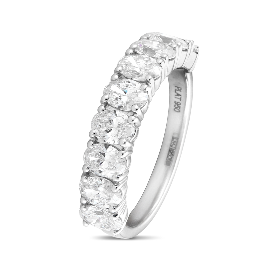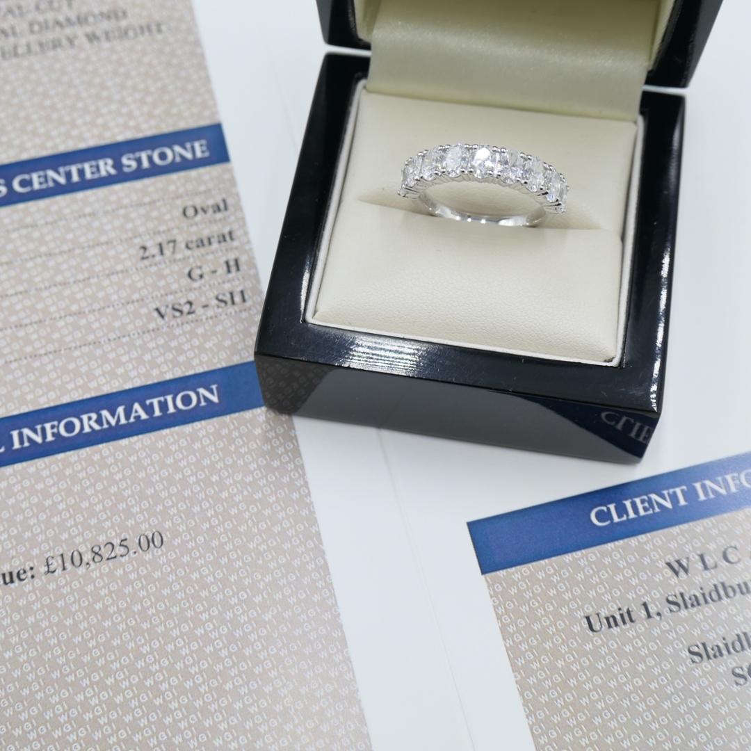 A brand-new, unused, certified platinum nine-stone eternity ring, this exceptional piece is set with nine oval-cut natural diamonds, totalling 2.17 carats. Each diamond, graded between VS2 and SI1 in clarity and G–H in colour, has been carefully matched to create a seamless row of brilliance across the finger. The elongated cut of the stones enhances their sparkle and elegance, while the strength and cool sheen of platinum provide a perfect setting that accentuates the natural radiance of the diamonds. Substantial in presence yet timeless in design, this ring strikes a balance between refinement and striking impact.