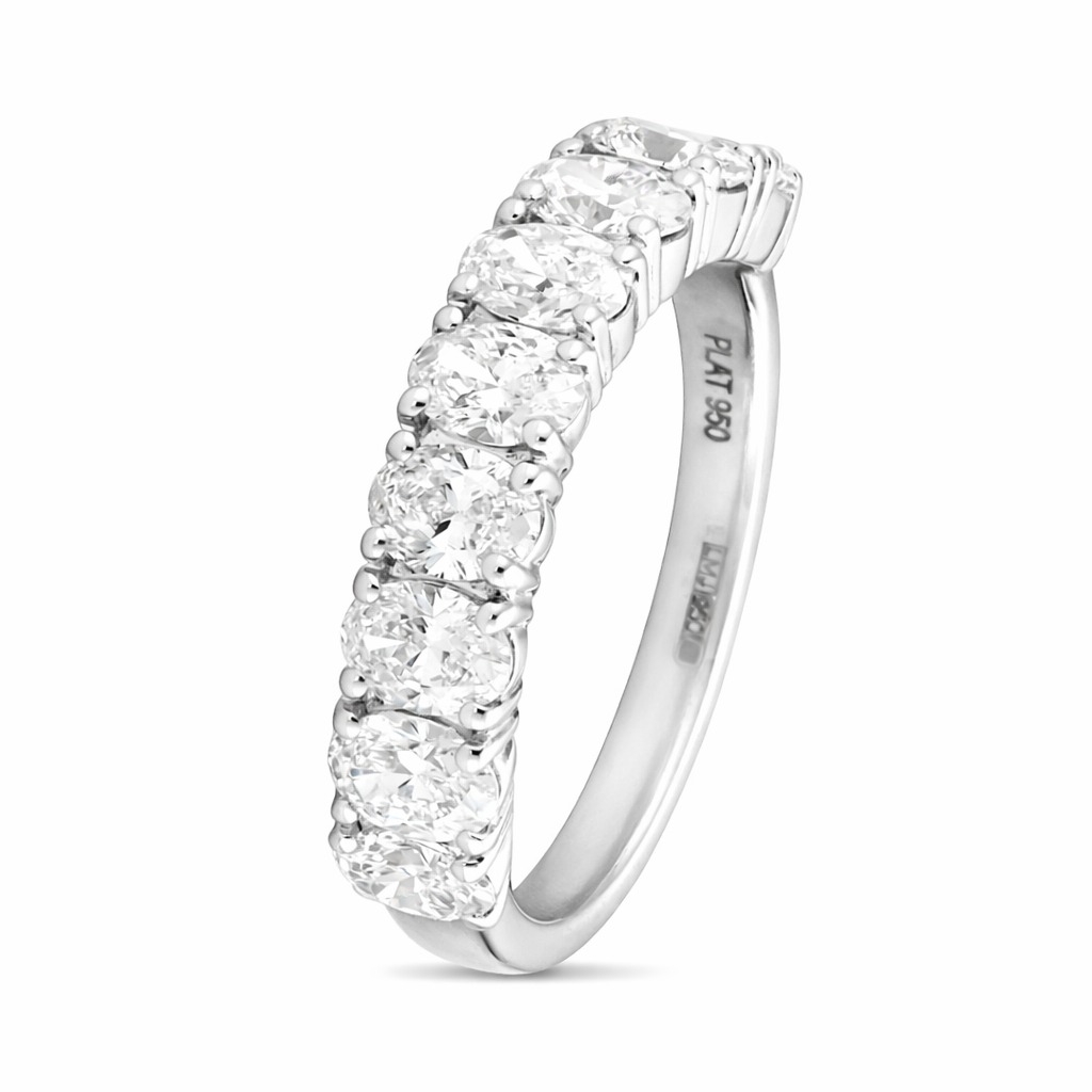 A brand-new, unused, certified platinum nine-stone eternity ring, this exceptional piece is set with nine oval-cut natural diamonds, totalling 2.17 carats. Each diamond, graded between VS2 and SI1 in clarity and G–H in colour, has been carefully matched to create a seamless row of brilliance across the finger. The elongated cut of the stones enhances their sparkle and elegance, while the strength and cool sheen of platinum provide a perfect setting that accentuates the diamonds' natural radiance. Substantial in presence yet timeless in design, this ring balances refinement with striking impact.