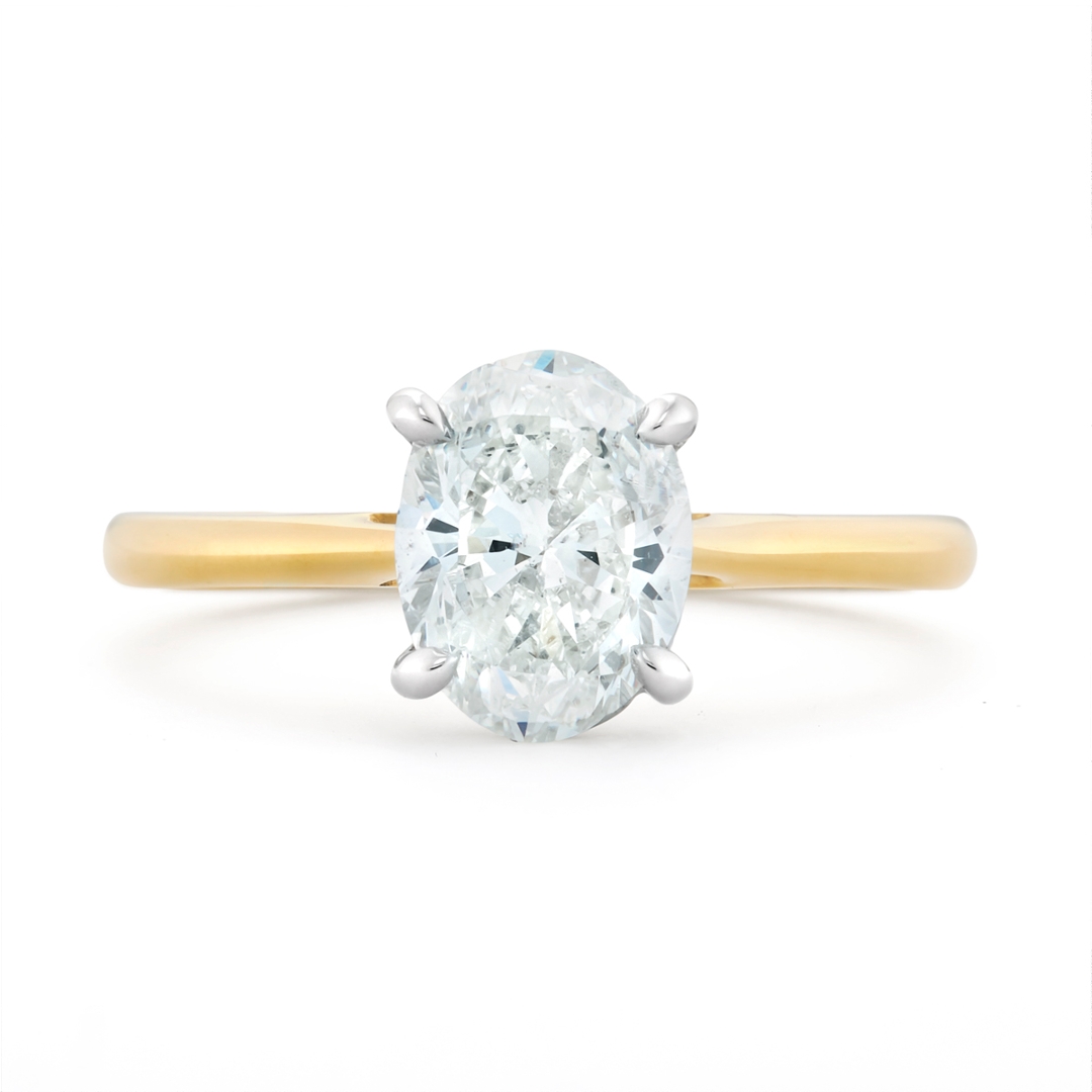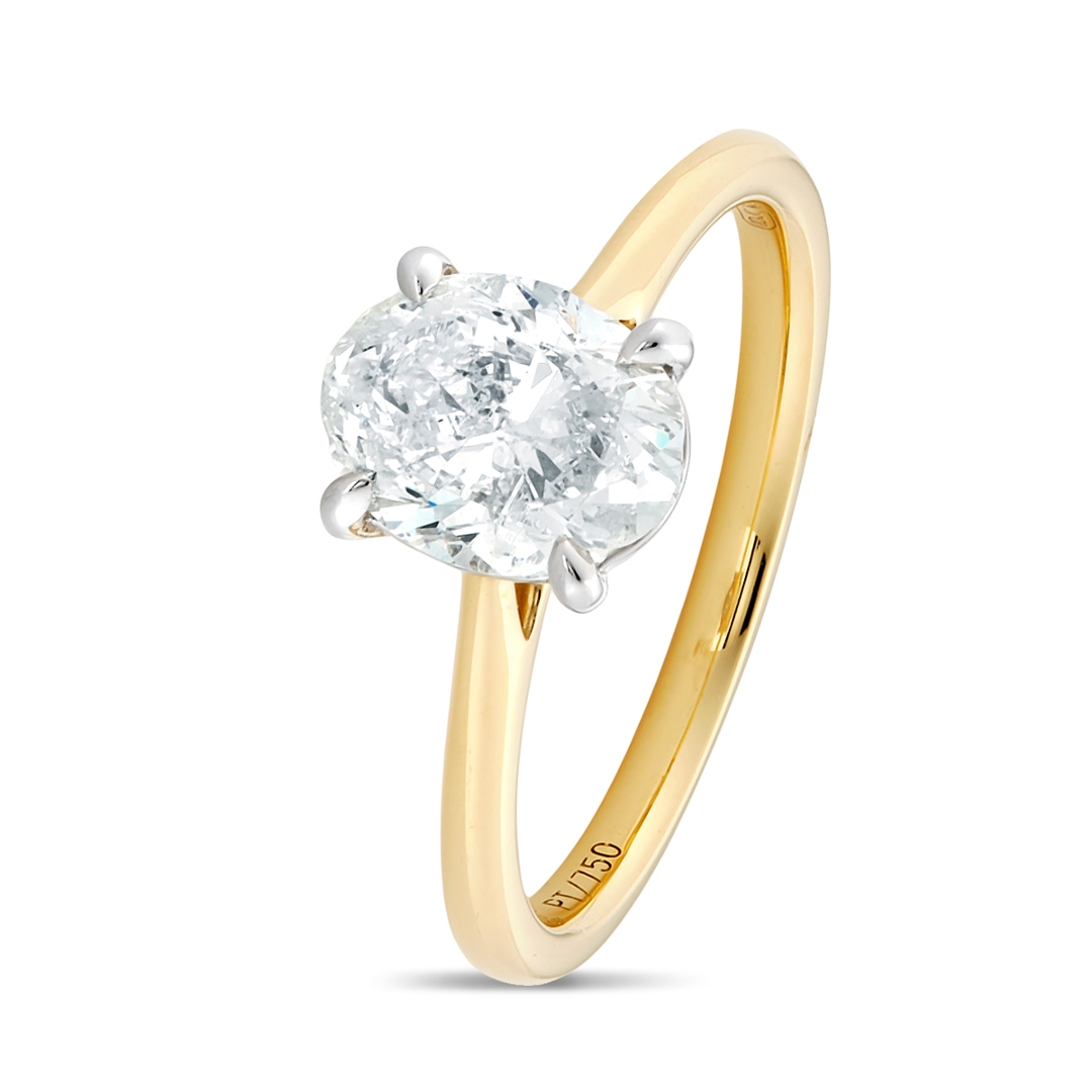 A brand-new, unused, certified 18ct yellow and white gold natural diamond solitaire engagement ring that reflects timeless craftsmanship and enduring beauty. At its centre lies a 1.61ct oval cut diamond, carefully selected for its graceful shape and radiant sparkle. With a clarity grade of SI2 and a colour grade of G, the diamond offers a captivating brilliance that strikes a balance between size, presence, and charm. Its natural origin enhances both its rarity and desirability, ensuring it remains a treasured choice.