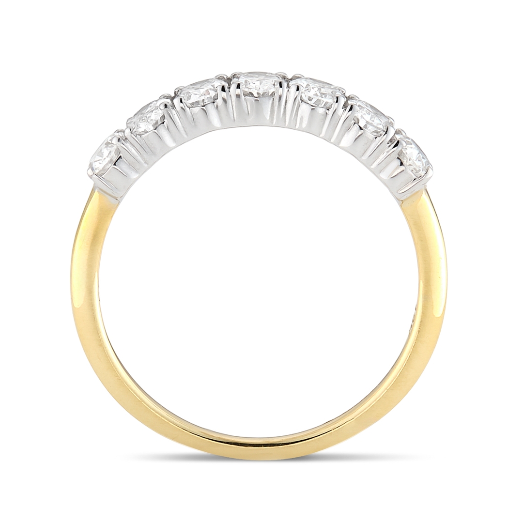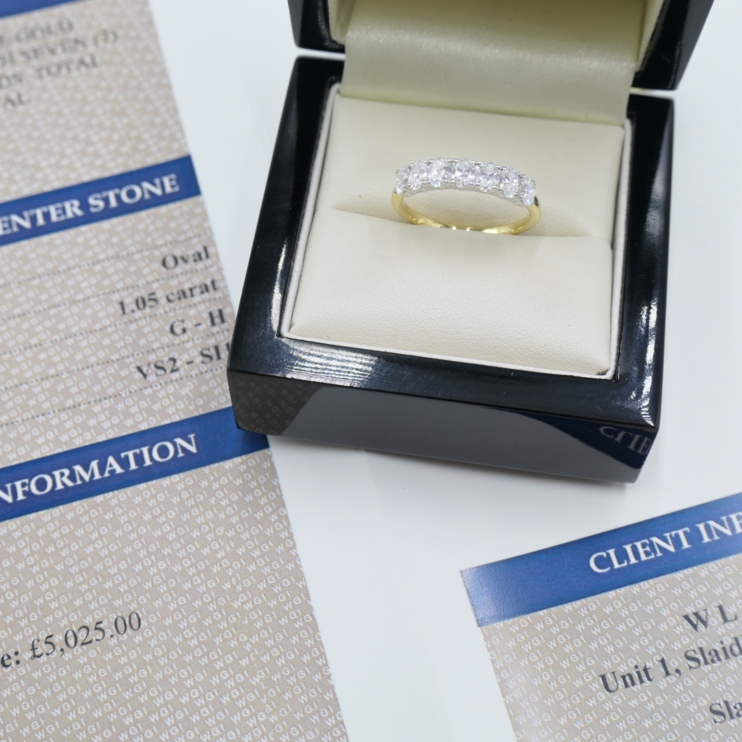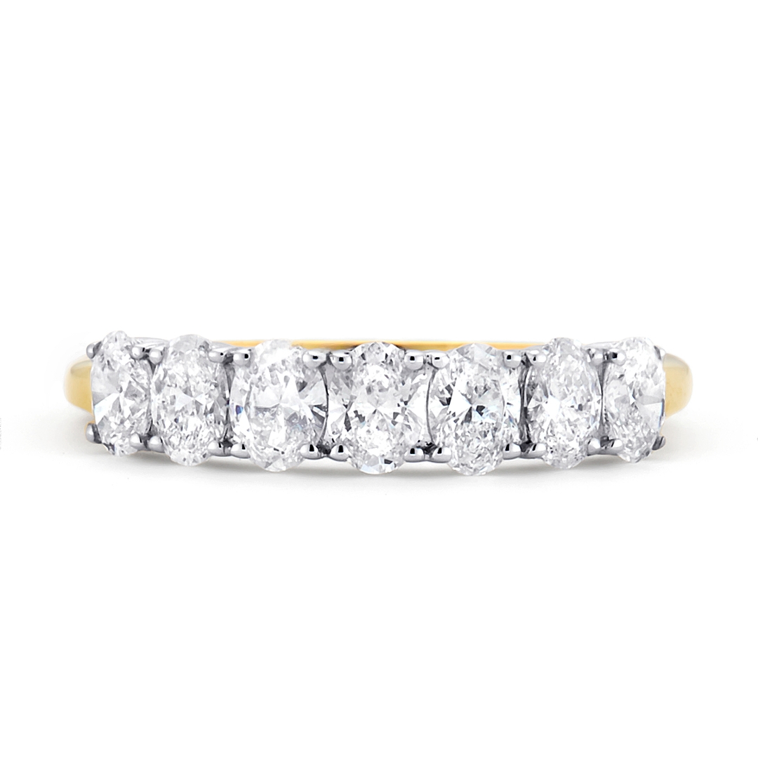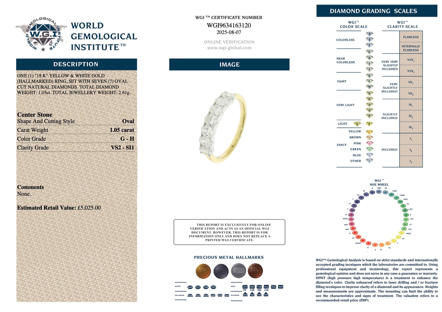 A brand-new, unused, certified 18ct yellow and white gold seven-stone eternity ring, this refined jewel is set with seven oval-cut natural diamonds weighing a total of 1.05 carats. Each diamond, graded between VS2 and SI1 in clarity and G–H in colour, has been carefully selected for its brilliance and uniformity, creating a seamless line of radiance across the finger. The elongated shape of the oval cut adds elegance and sparkle, while the combination of yellow and white gold enhances the stones' brightness with warmth and contrast. Balanced in design and graceful in proportion, this timeless ring celebrates both craftsmanship and natural beauty.