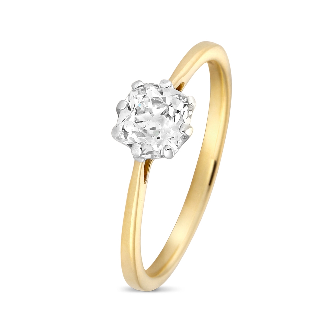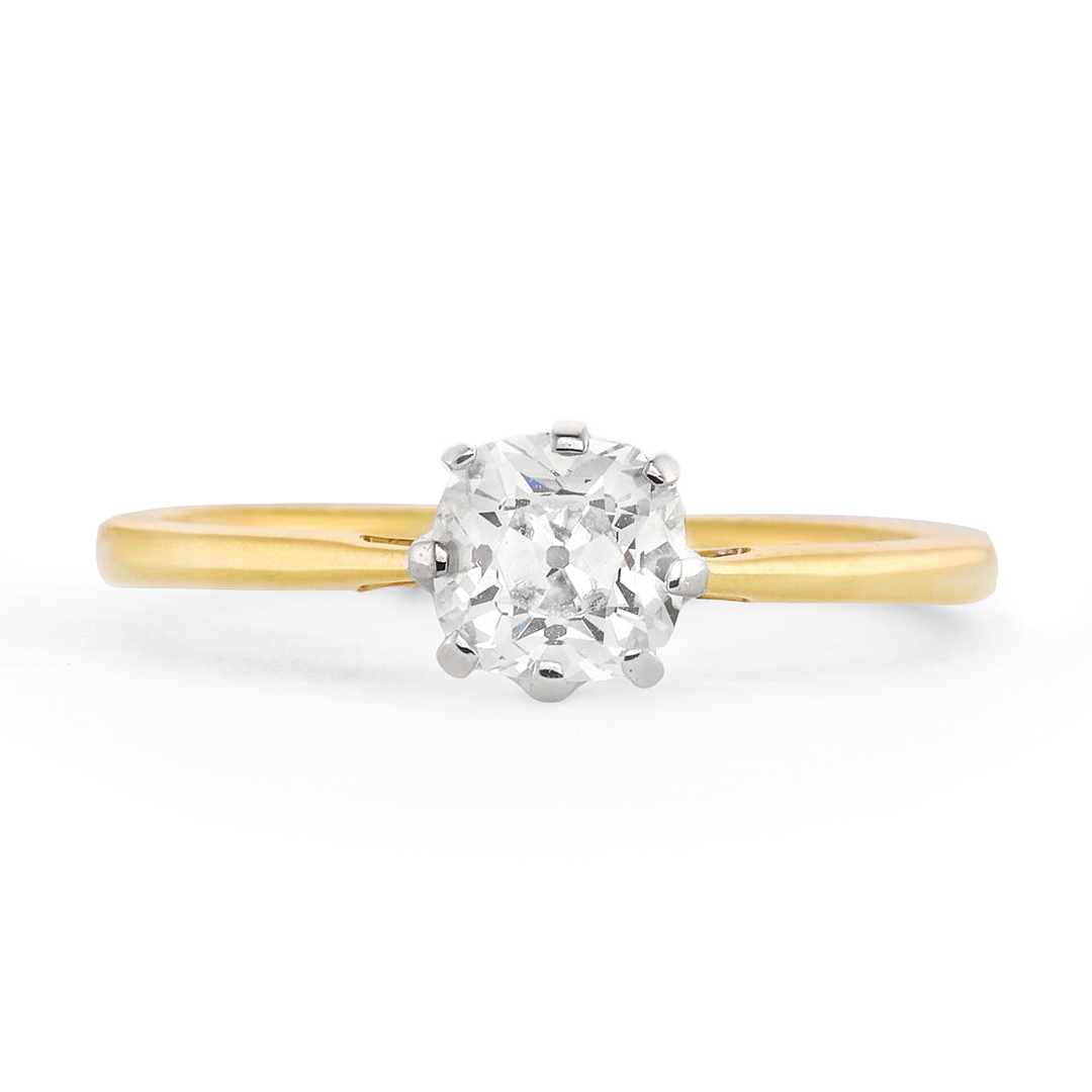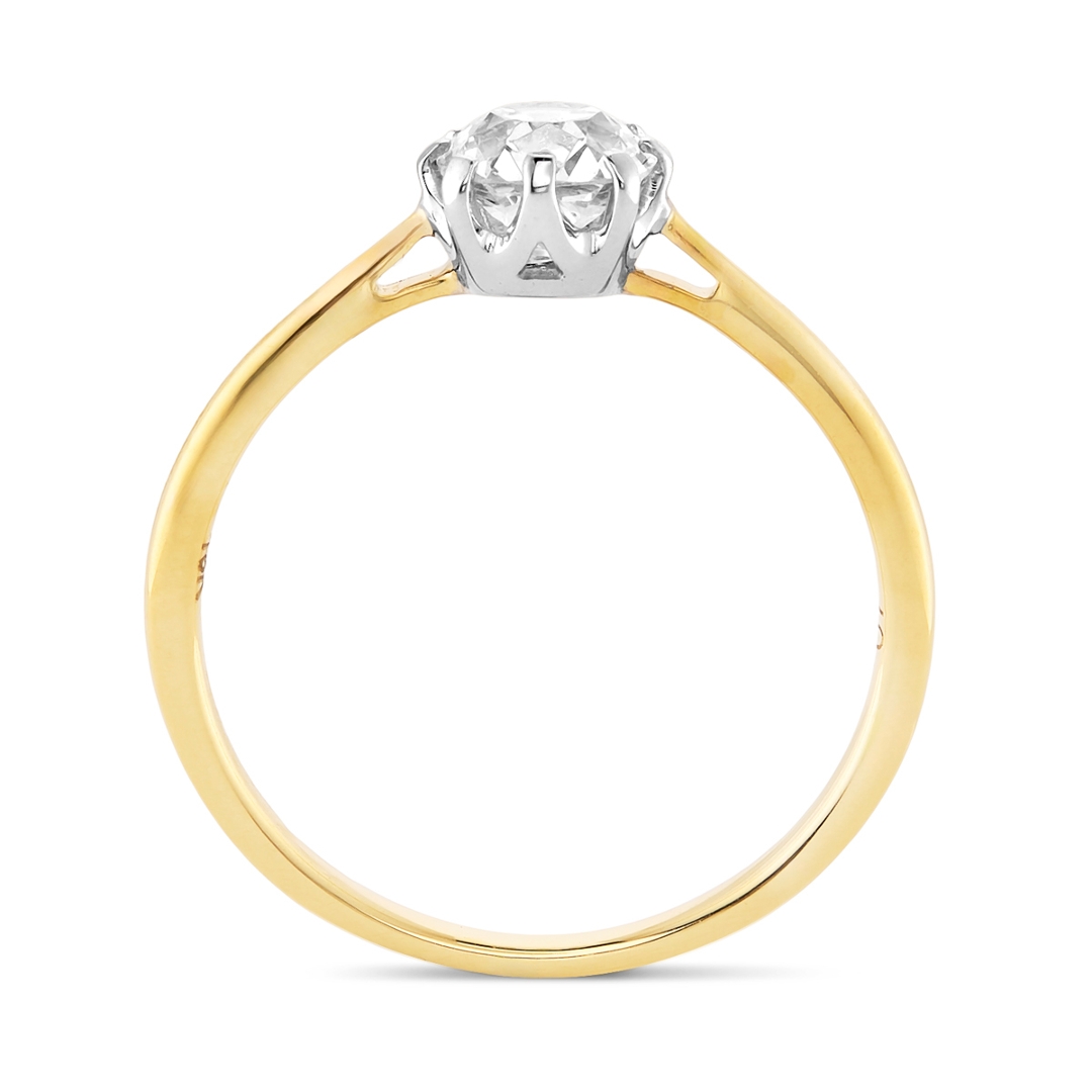 A brand-new, unused certified 18ct yellow gold and platinum engagement ring featuring a captivating round-cut natural diamond. The centre stone weighs 0.72 carats and is graded VS2 for clarity, ensuring fine internal quality with excellent brilliance. Its L colour grade gives the diamond a warm and distinctive tone, enhancing its antique charm and individuality. Set securely within a platinum mount against the rich backdrop of yellow gold, the contrast between metals highlights the stone’s character, making this ring a striking and elegant choice.