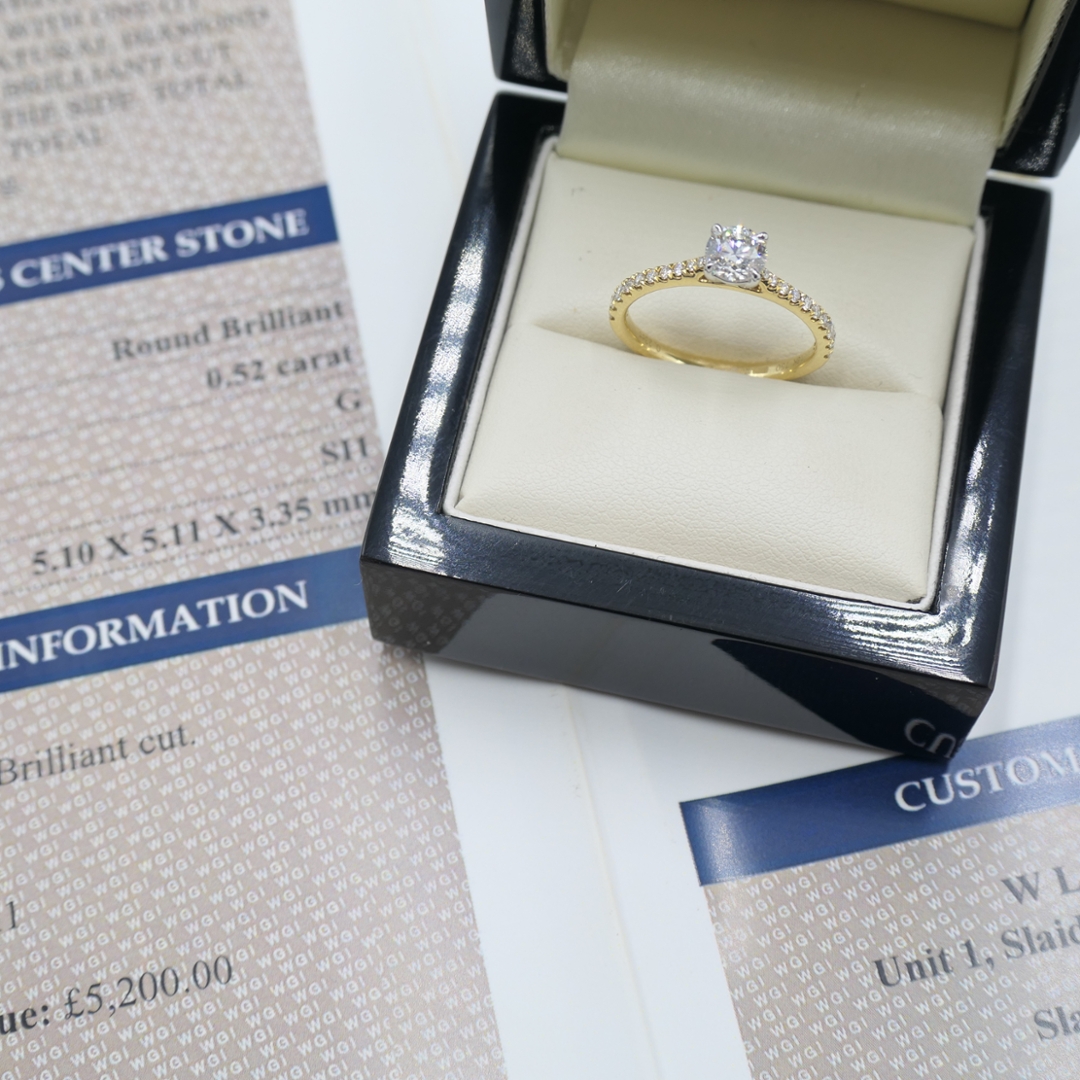 A brand-new, unused certified natural diamond solitaire engagement ring that radiates timeless elegance and refined brilliance. At its heart sits a 0.52-carat brilliant-cut natural diamond, graded G in colour and SI1 in clarity, offering exceptional fire and luminosity. The centre stone is complemented by a delicate cluster of brilliant-cut diamonds along the shoulders, totalling 0.23 carats, graded F–G in colour and VS2–SI1 in clarity. Together, the diamonds create a stunning display of sparkle and balance, enhancing the centre stone’s natural beauty and brilliance with harmonious precision.