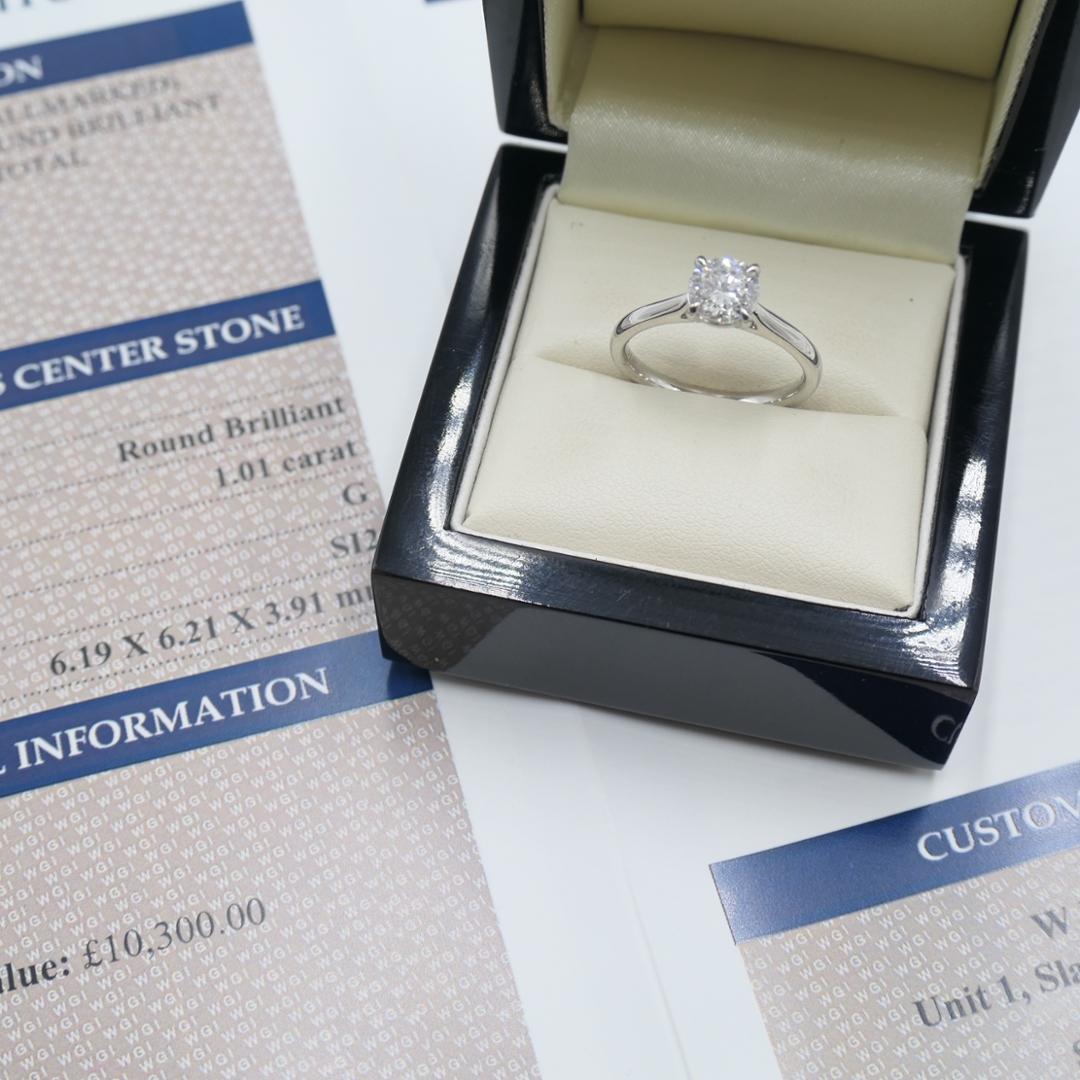 A brand-new, unused, certified platinum natural diamond solitaire engagement ring, thoughtfully crafted to offer timeless sophistication and enduring meaning. At its heart is a 1.01ct brilliant-cut diamond, carefully selected for its size, sparkle, and balance. With a G colour grade and SI2 clarity, this diamond presents a bright, near-colourless brilliance, accompanied by subtle natural inclusions that remain gentle to the eye, preserving the stone’s radiant appeal. The expert cut maximises fire and scintillation, making it an eye-catching centrepiece.