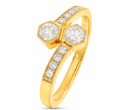 The shoulders are delicately adorned with a cluster of brilliant-cut diamonds, totalling 0.24ct. Graded SI1 for clarity and F-G for colour, these stones complement the centre diamond beautifully, creating an impressive display of fire and light. The dual-tone setting of platinum and 18ct yellow gold enhances the overall design, with platinum providing strength and durability. In contrast, the yellow gold brings richness and character, ensuring a striking contrast that elevates the piece.