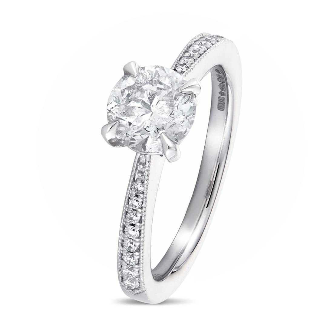 A brand-new, unused, certified platinum natural diamond solitaire engagement ring that perfectly blends refined sparkle with timeless sophistication. At its centre is a dazzling 1.24ct brilliant-cut natural diamond, graded F for colour and SI3 for clarity, offering a bright, near-colourless shine that draws the eye and radiates pure elegance. Enhancing the centrepiece is a graceful cluster of brilliant-cut diamonds set along the shoulders, totalling 0.12ct. These accent stones, graded G–H for colour and SI1–SI2 for clarity, add an extra layer of brilliance, enhancing the ring’s light-catching appeal without distracting from its striking centre.