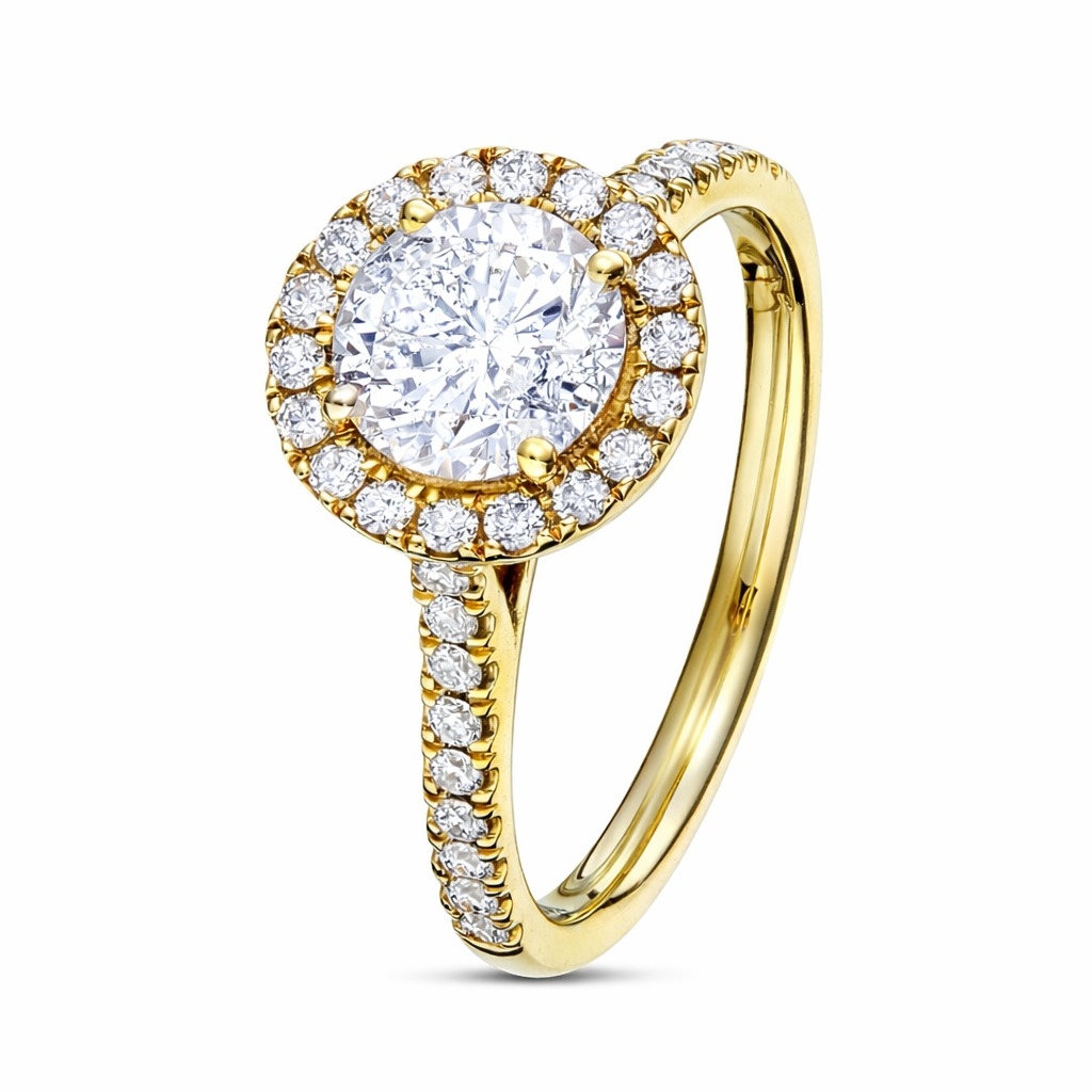 A brand-new, unused, certified natural diamond solitaire engagement ring, set with one brilliant-cut diamond at the centre & a cluster of brilliant-cut diamonds in a halo setting, with additional diamonds on the shoulders, set in 18ct yellow gold.