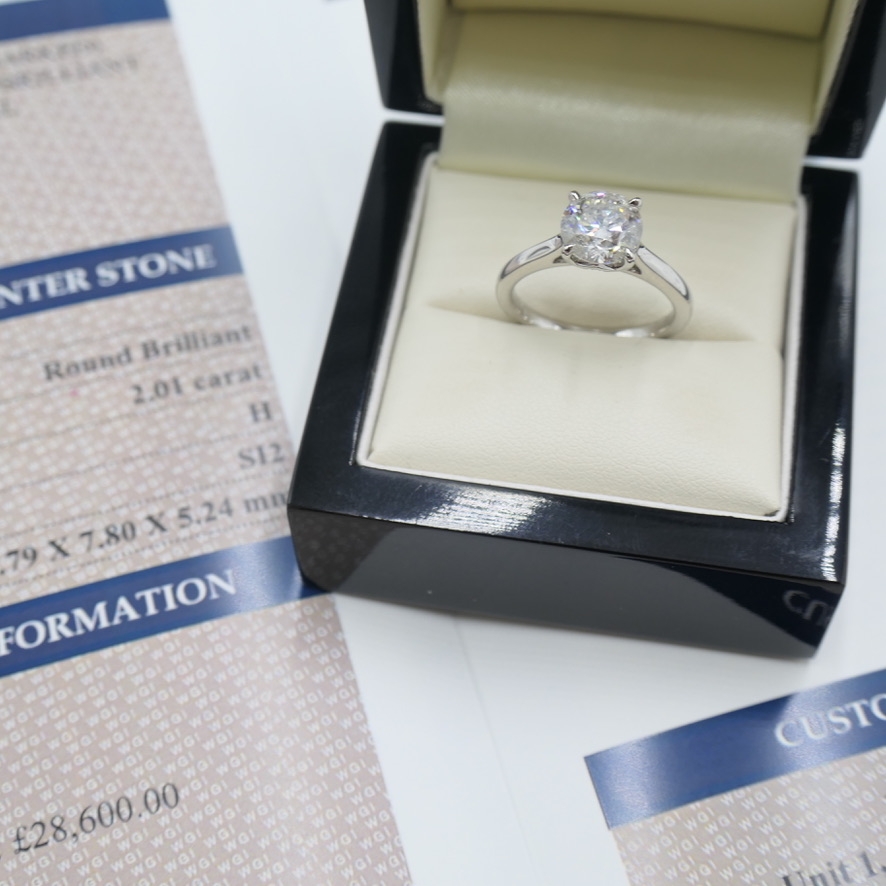 A brand-new, unused, certified natural diamond solitaire engagement ring, this exceptional piece epitomises timeless luxury and refined craftsmanship. At its heart rests a breathtaking 2.01-carat brilliant-cut natural diamond, graded H in colour and SI2 in clarity. The diamond’s exceptional fire and brilliance are revealed through its expert cut, reflecting light with captivating intensity from every angle. As a true symbol of love and elegance, the centre stone commands attention with its remarkable sparkle and perfect proportions, embodying both beauty and sophistication.
