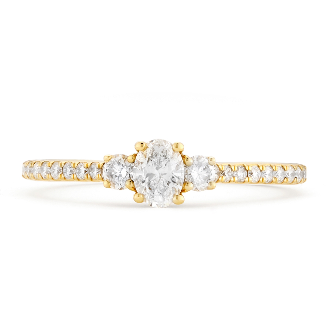 A brand-new, unused certified 18ct yellow gold three-stone cluster ring, this beautifully crafted piece is set with a central 0.30ct oval-cut natural diamond of SI1 clarity and fine F colour. Flanked by two brilliant-cut diamonds with a combined weight of 0.30ct, also SI1 clarity and F–G colour, the arrangement creates a striking balance of shape and sparkle. Additional clusters of brilliant-cut diamonds extend along the shoulders, adding radiance to the design. The warm glow of yellow gold enhances the fire of the diamonds, giving the ring a rich and timeless elegance that stands out on the finger.