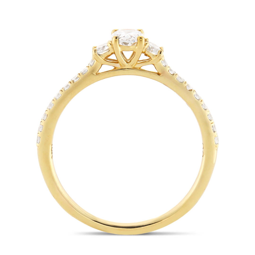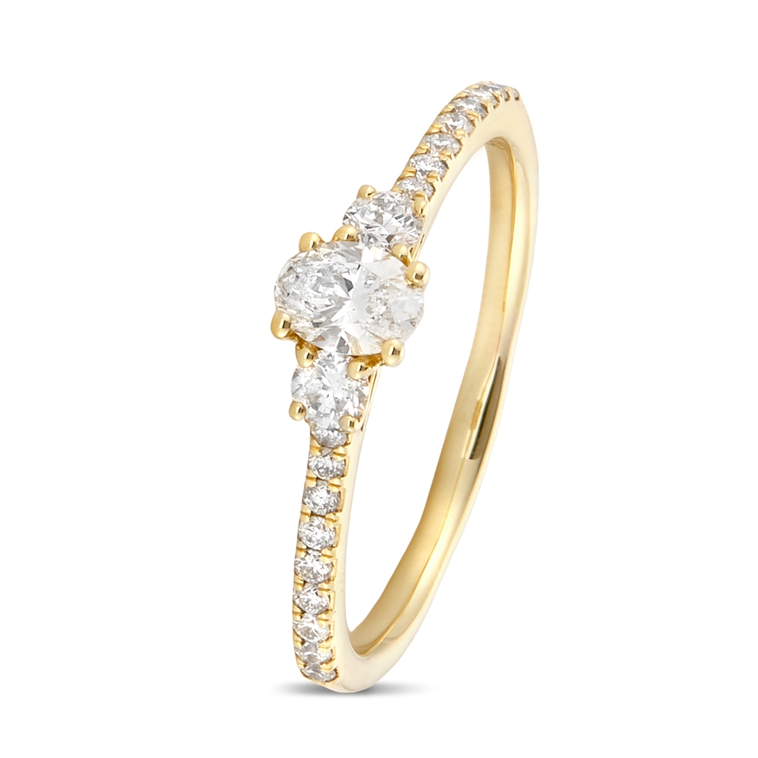 A brand new, unused, certified 18ct yellow gold natural diamond three-stone cluster ring set with one oval cut diamond to the centre, two brilliant cut diamonds to the sides & a cluster of brilliant cut diamonds to the shoulders.
