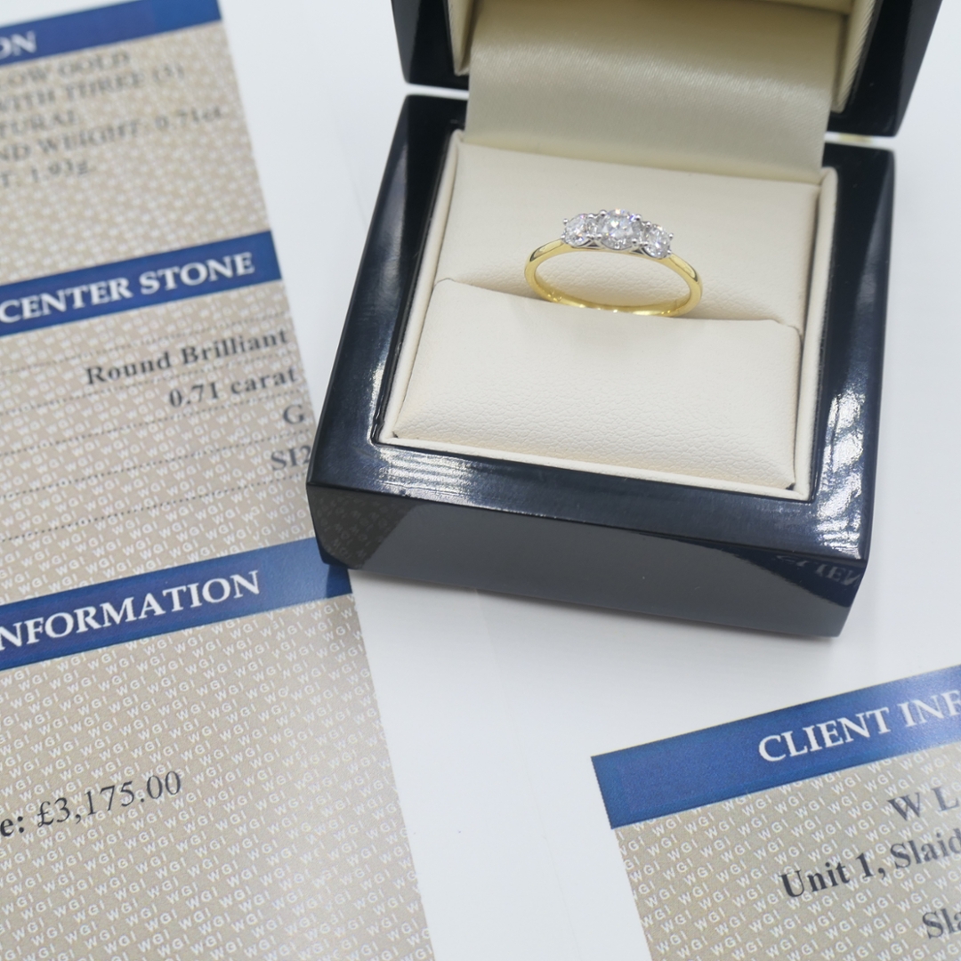 A brand-new, unused, certified 18ct white and yellow gold eternity ring, this refined design showcases three natural brilliant-cut diamonds with a combined weight of 0.71ct. Each stone is graded G in colour with SI2 clarity, chosen for its bright sparkle and lively fire. The dual tones of white and yellow gold create an elegant contrast, enhancing the natural radiance of the diamonds and providing a classic, versatile finish. With a weight of 1.93 grams. The three-stone setting adds symbolic meaning, often representing a journey through past, present and future, making this ring both personal and timeless.