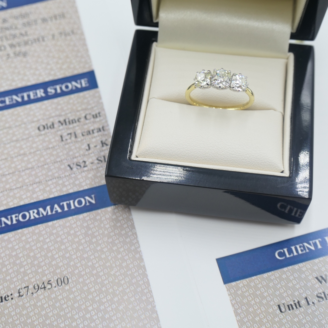 A brand-new, unused, certified natural diamond three-stone eternity ring, this exquisite piece is a timeless tribute to love, heritage, and craftsmanship. Set with three beautifully proportioned round-cut natural diamonds, weighing 1.71 carats in total, this design captures the romance and charm of antique-inspired jewellery. Each diamond, graded J–K in colour and VS2–SI1 in clarity, radiates a soft, warm brilliance, its hand-faceted style reflecting light with a captivating depth and fire that modern cuts rarely replicate.