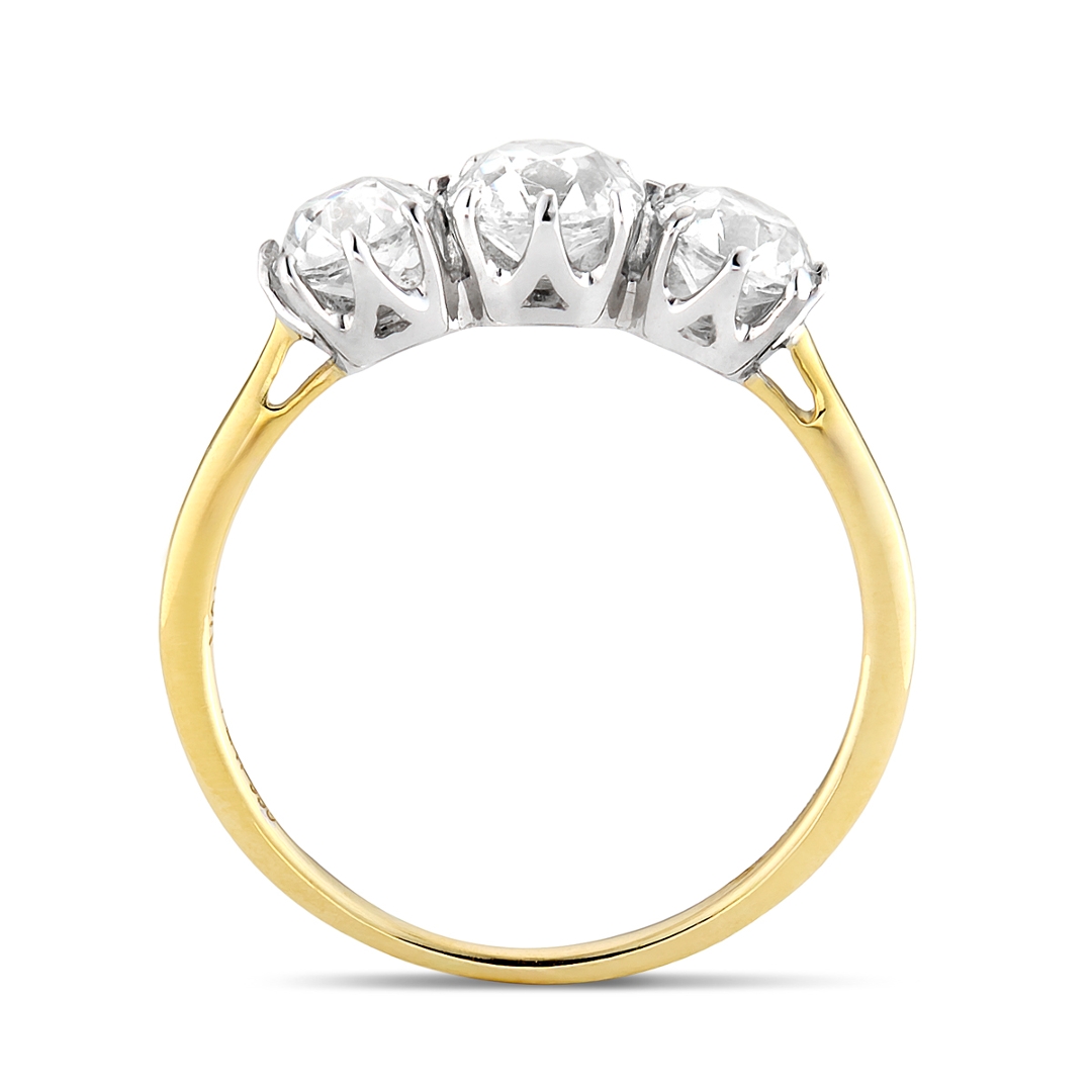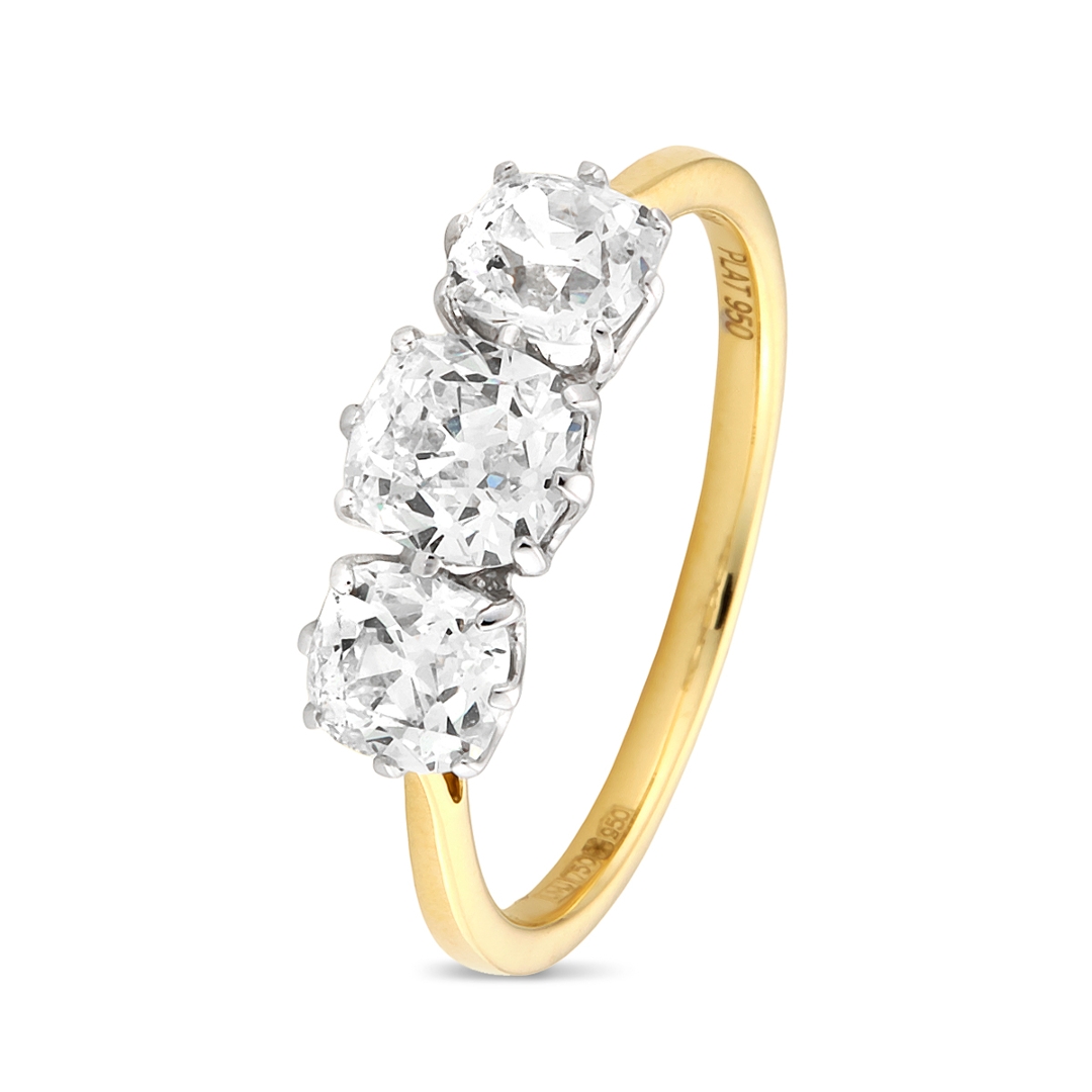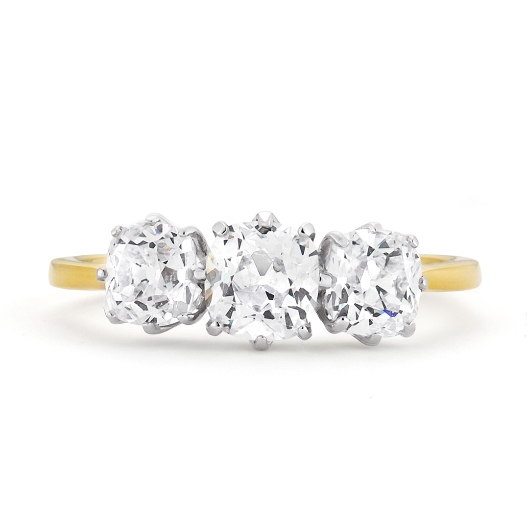The setting combines the strength of platinum with the warmth of 18ct yellow gold, creating a striking contrast that enhances the natural beauty of the diamonds. The platinum provides a secure, luminous foundation for the stones, while the yellow gold band adds a touch of vintage-inspired richness. Each diamond is expertly set to maximise its brilliance and symmetry, ensuring a perfect balance of elegance, comfort, and enduring style.