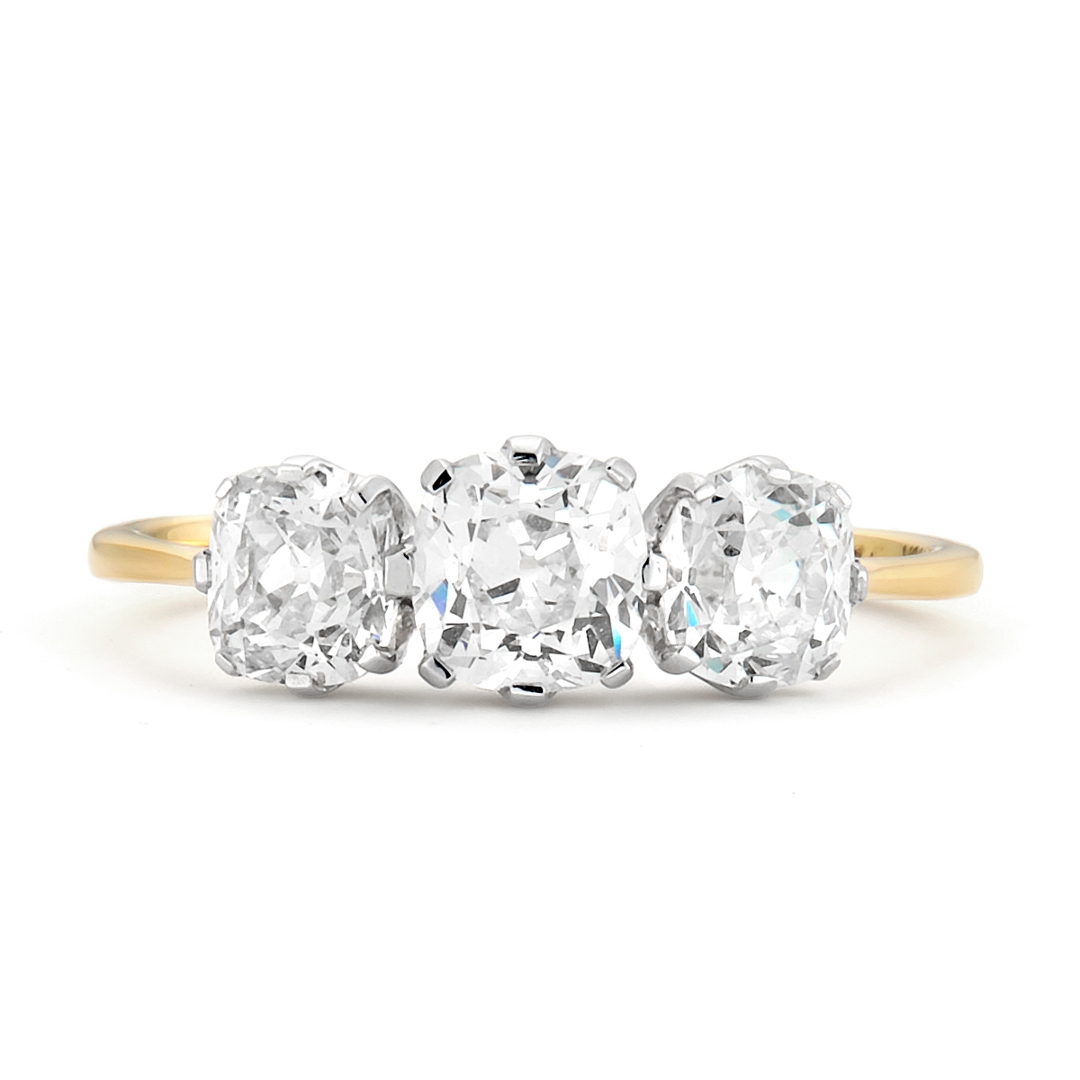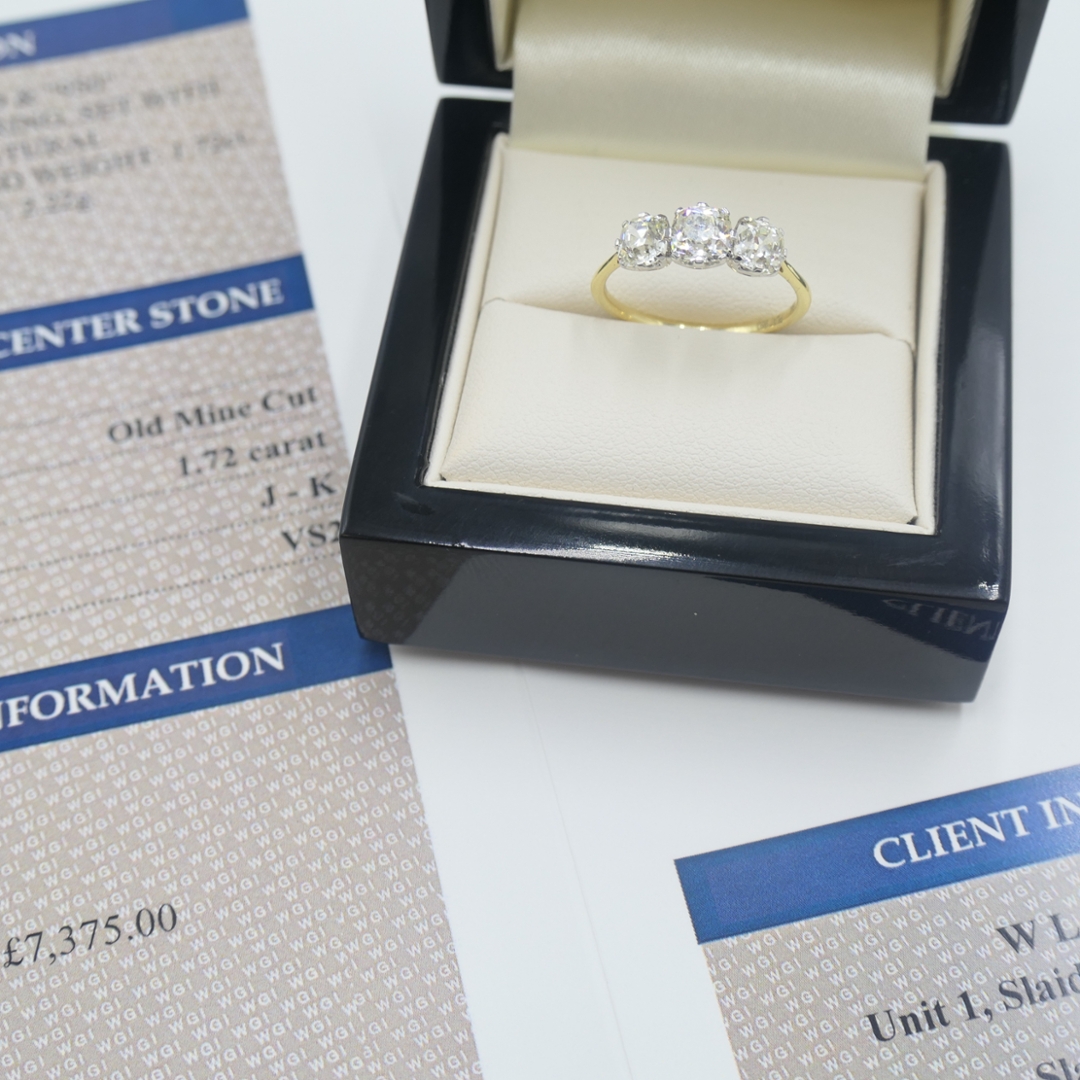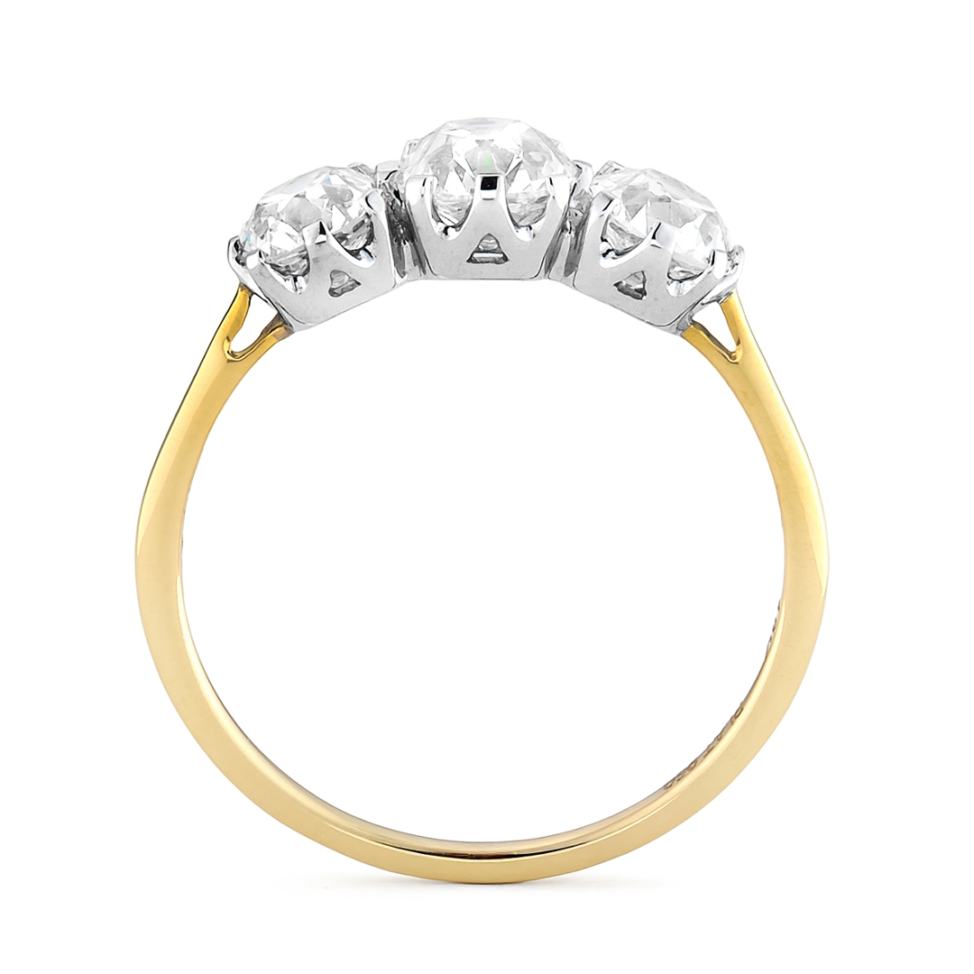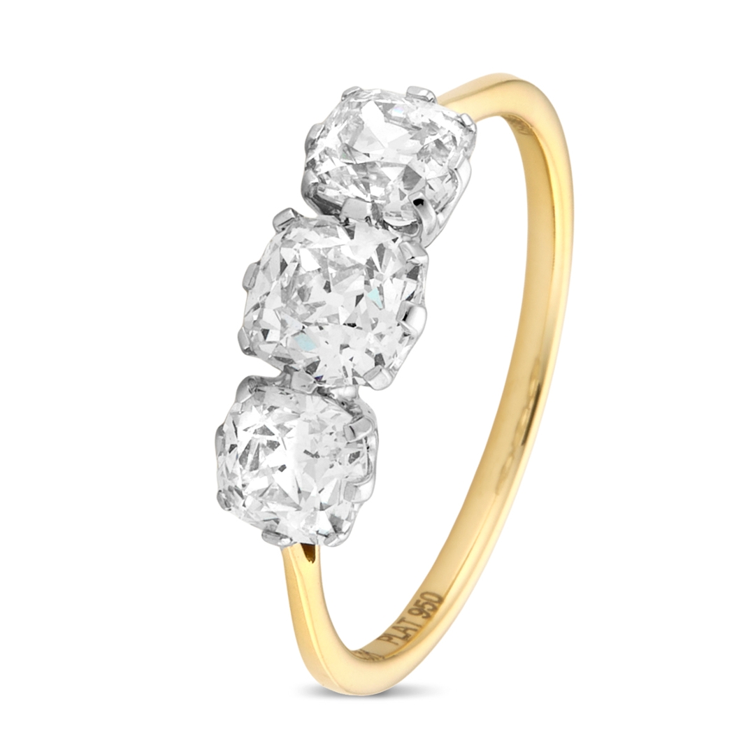 A brand-new, unused certified platinum and 18ct yellow gold three-stone eternity ring, this elegant piece is set with three round-cut natural diamonds weighing a total of 1.72ct. Each diamond, graded VS2 in clarity and J–K in colour, has been selected for its charm and individuality. The round-cut, with its broader facets and softer brilliance, captures light in a uniquely romantic way, offering depth and warmth that are distinct from those of modern cuts. The combination of platinum’s durability and yellow gold’s rich tone provides both strength and contrast, enhancing the natural sparkle of the diamonds while giving the ring a timeless, refined appeal. Weighing 2.22 grams in weight.