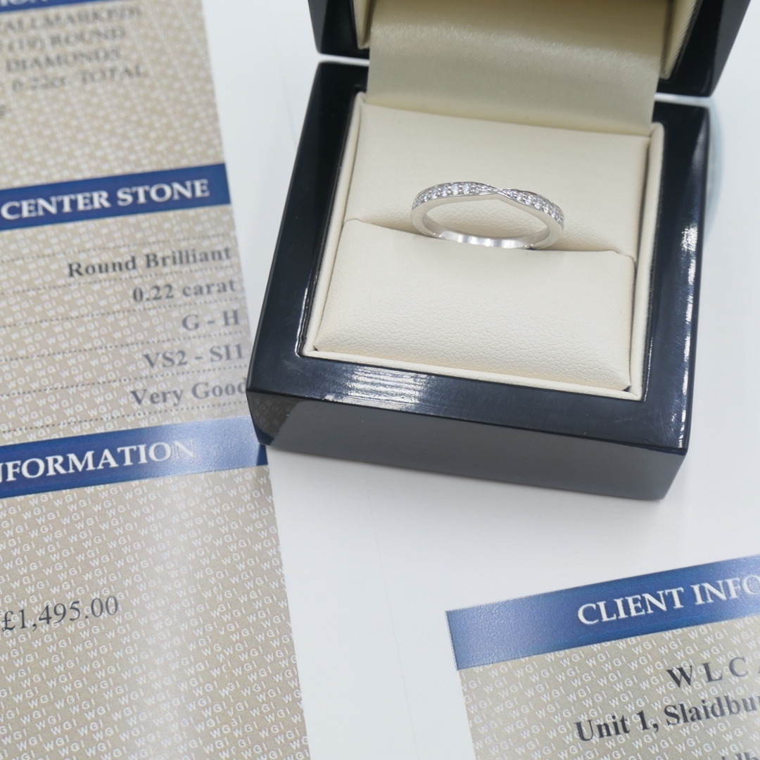 A brand-new, unused certified platinum wedding ring, this refined piece is set with a cluster of natural brilliant cut diamonds that deliver a delicate yet captivating sparkle. With a total weight of 0.22ct, the diamonds are graded G-H in colour and VS2-SI1 in clarity, chosen for their lively brilliance and crisp appearance. The strength and cool sheen of platinum provide the perfect setting, enhancing the radiance of the stones while ensuring exceptional durability. Designed with understated elegance, this ring is a versatile choice, whether worn as a wedding band, an anniversary gift, or simply as a timeless piece of fine jewellery.