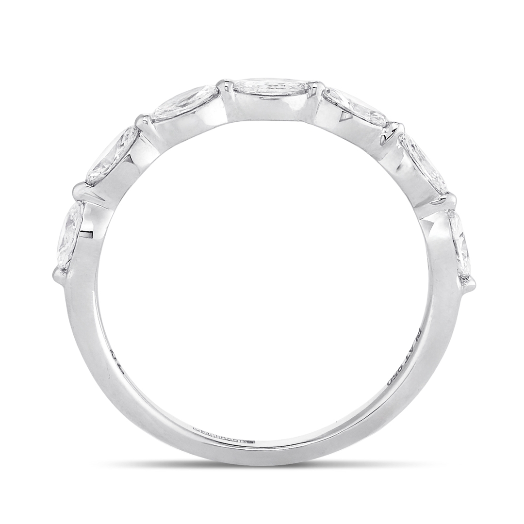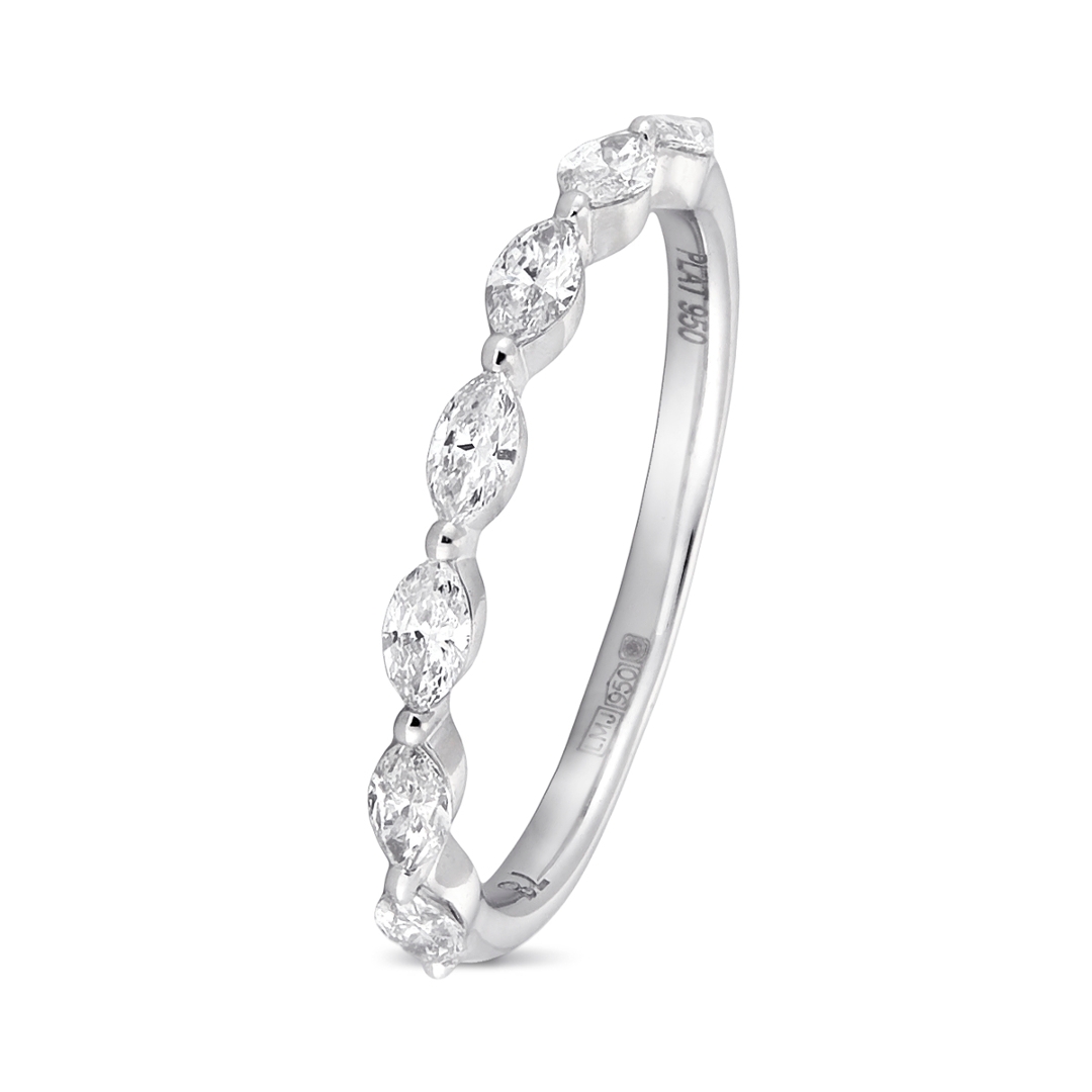 A brand-new, unused platinum natural diamond wedding ring, beautifully crafted and set with seven marquise-cut natural diamonds. Weighing a total of 0.50 carats, the stones are graded F–G in colour and VS2–SI1 in clarity, offering a bright, near-colourless sparkle with refined brilliance. The marquise cut, renowned for its elongated and elegant silhouette, lends the ring a distinctive look, while the sleek platinum band accentuates the fire and lustre of the stones. Weighing 2.24g, the ring balances delicacy with durability, making it a perfect symbol of enduring love and commitment.