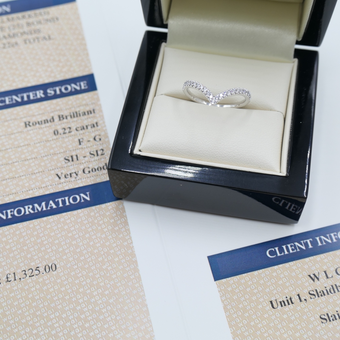 A brand-new, unused, certified natural diamond wishbone eternity ring showcasing timeless elegance and graceful design. Set with a cluster of brilliant-cut natural diamonds totalling 0.22ct, this beautiful piece sparkles with refined brilliance and sophistication. The diamonds, graded F–G in colour and SI1–SI2 in clarity, offer exceptional luminosity and perfectly complement the flowing wishbone design. Crafted in luxurious platinum, the ring’s smooth and durable finish enhances the diamonds’ natural radiance while ensuring strength and lasting beauty. With a total weight of 2.80 grams and a professional valuation of £1,325, this ring represents understated luxury and exceptional craftsmanship.