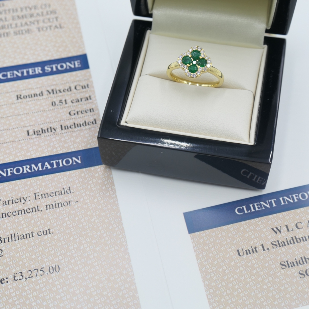A brand new, unused, certified natural diamond & emerald gemstone four-leaf clover-shaped cluster ring, set with five round mixed-cut emerald gemstones to the centre & a cluster of brilliant-cut diamonds in a halo setting, set in 18ct yellow gold.
