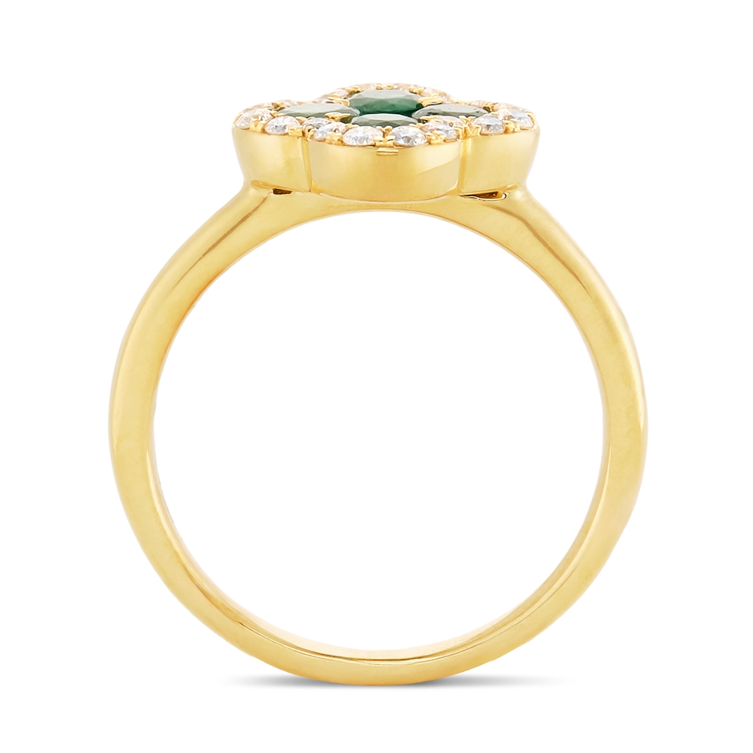 Expertly crafted in luxurious 18ct yellow gold, the setting enhances the warmth and radiance of the gemstones, while its intricate design captures the elegance of fine craftsmanship. Each stone has been precisely cut and meticulously set to achieve flawless symmetry and lasting beauty. The unique four-leaf clover motif lends the ring a distinct and meaningful charm, making it both a stylish statement and a sentimental treasure.