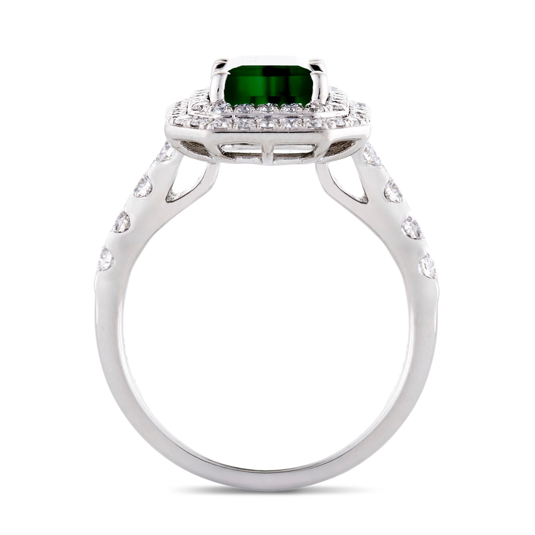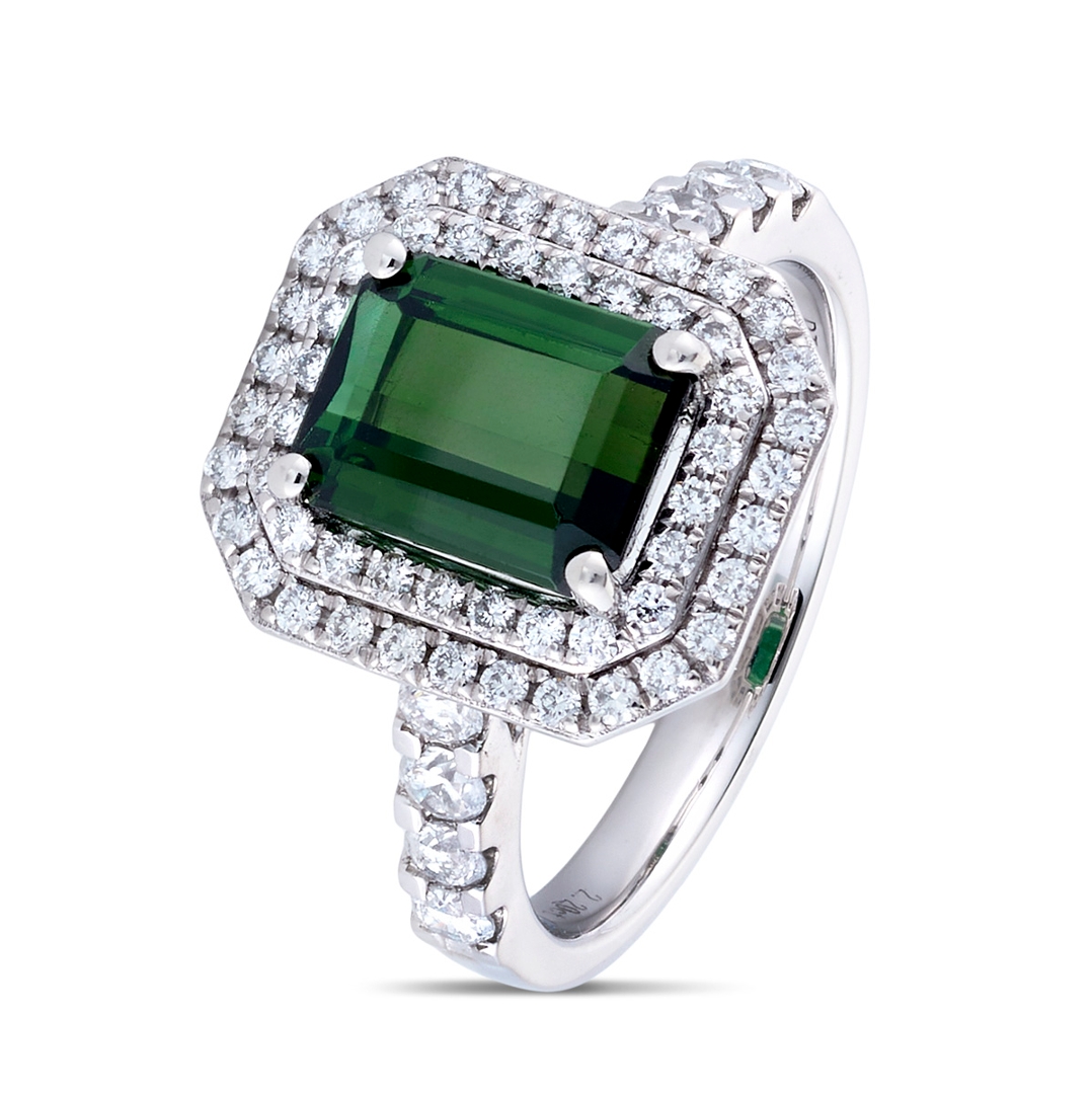 A brand new, unused, certified natural diamond & green tourmaline gemstone cluster ring, set with one octagonal step cut green tourmaline gemstone to the centre & a cluster of brilliant cut diamonds in a double halo setting & to the shoulders, set in platinum.