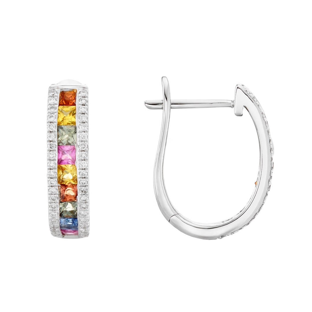 A brand-new, unused certified pair of 18ct white gold hooped earrings, combining vibrant colour with the timeless sparkle of natural diamonds. Each earring is set with a total of 1.08ct of square, mixed-cut, multi-coloured sapphires, carefully chosen for their rich tones, fine clarity, and lively brilliance. These sapphires form a captivating display of colour, beautifully complemented by 0.20ct of natural brilliant cut diamonds, graded G-H in colour and VS2-SI1 in clarity. The crisp radiance of the diamonds enhances the cool elegance of the white gold, creating a refined contrast that makes these earrings both eye-catching and sophisticated.