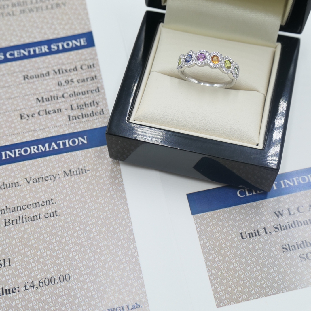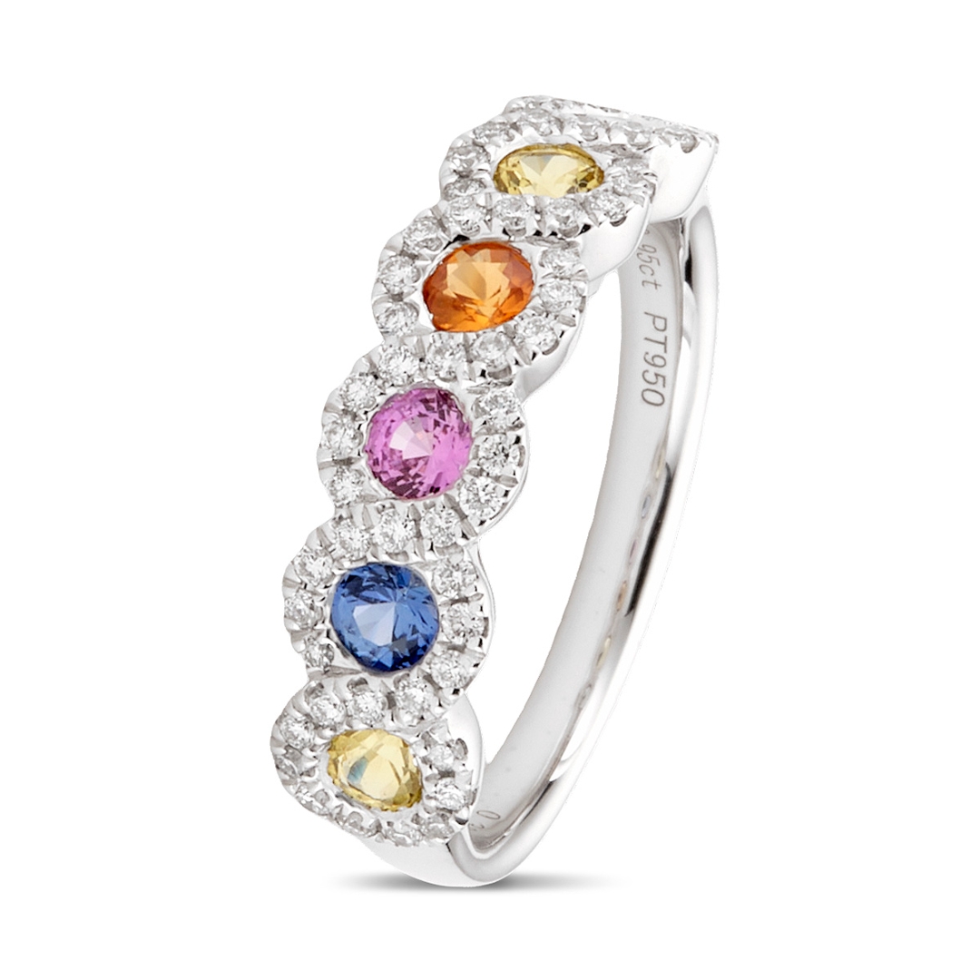 A brand-new, unused certified platinum ring showcasing a vibrant cluster of round mixed-cut multi-coloured sapphires totalling 0.95ct. Each sapphire offers a unique hue, creating a vibrant spectrum of colour that captures attention from every angle. Surrounding this radiant display is a halo of brilliant-cut natural diamonds, totalling 0.30ct, graded G-H in colour and VS2-SI1 in clarity. The superb lustre of the platinum setting provides the perfect contrast, amplifying the vivid tones of the sapphires and the crisp sparkle of the diamonds, resulting in a design that is both elegant and eye-catching.
