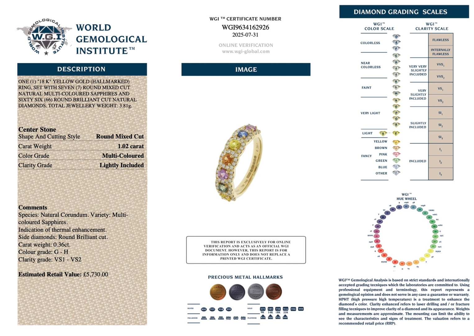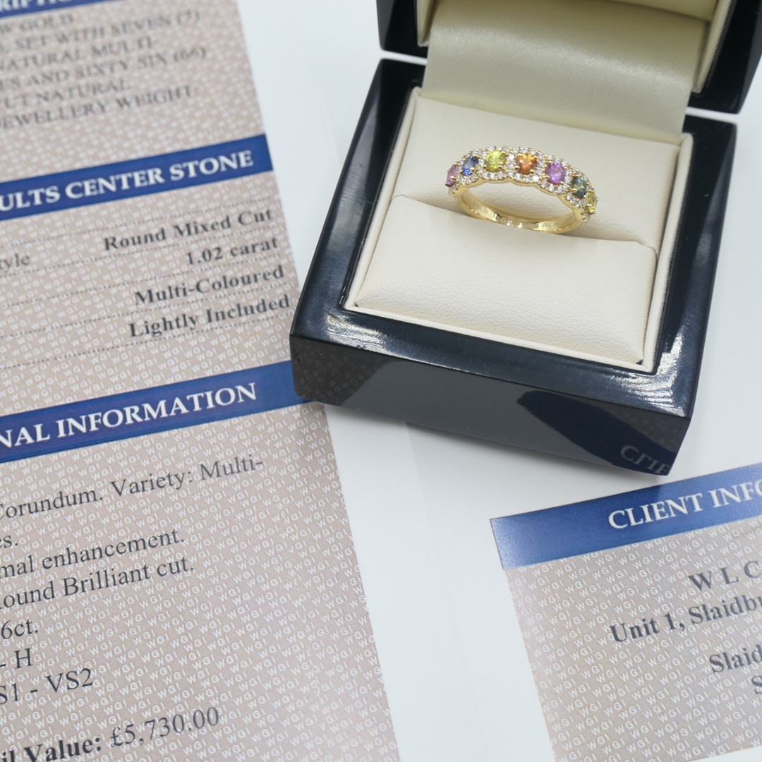 With an expert valuation of £5,730.00, this remarkable ring offers the perfect fusion of vivid gemstones, masterful craftsmanship, and the lasting value of natural diamonds—an heirloom-quality piece to treasure for a lifetime.