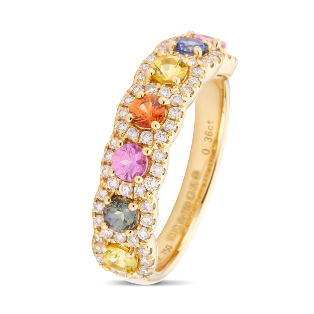 A brand-new, unused certified 18ct yellow gold ring, designed to dazzle with its rich display of colour and brilliance. At the heart of this striking piece lies a cluster of round, mixed-cut, multi-coloured sapphires, totalling an impressive 1.02ct, each stone offering its own vibrant hue and character. Encircling the sapphires is a halo of brilliant-cut natural diamonds, weighing a combined 0.36ct and graded G-H in colour and VS1-VS2 in clarity. The warm glow of the yellow gold setting enhances the fiery sparkle of the diamonds and intensifies the vivid tones of the sapphires, creating a piece of jewellery that radiates luxury and sophistication.