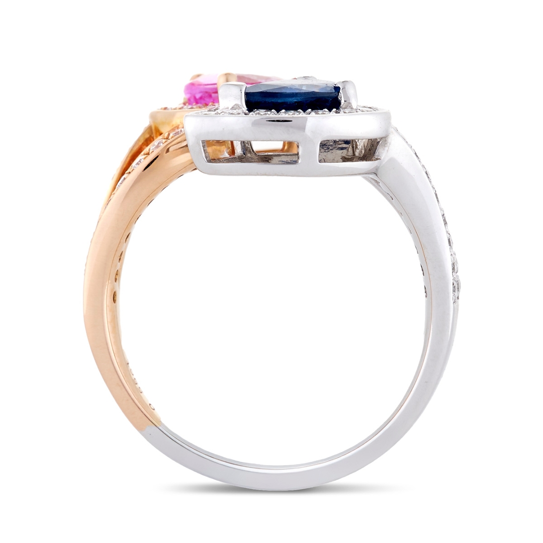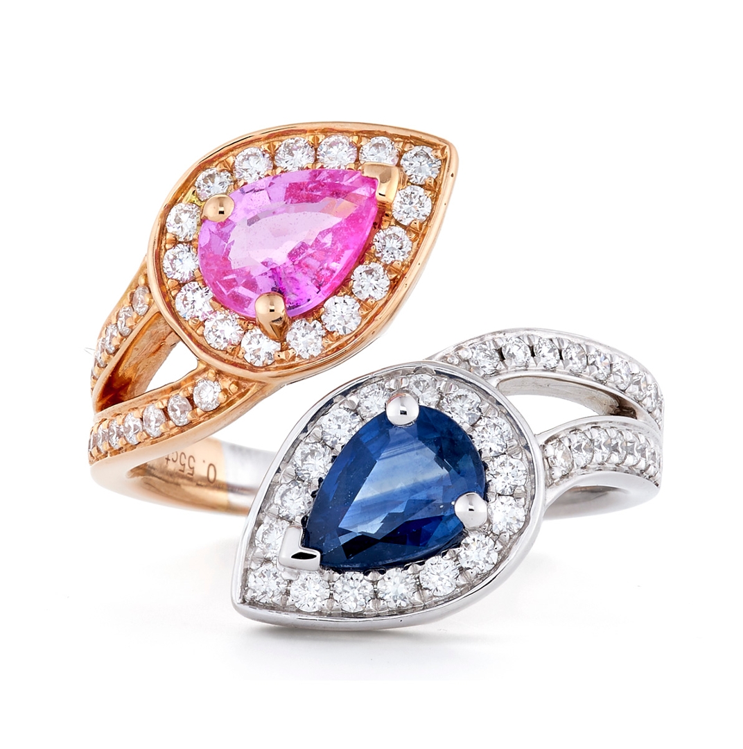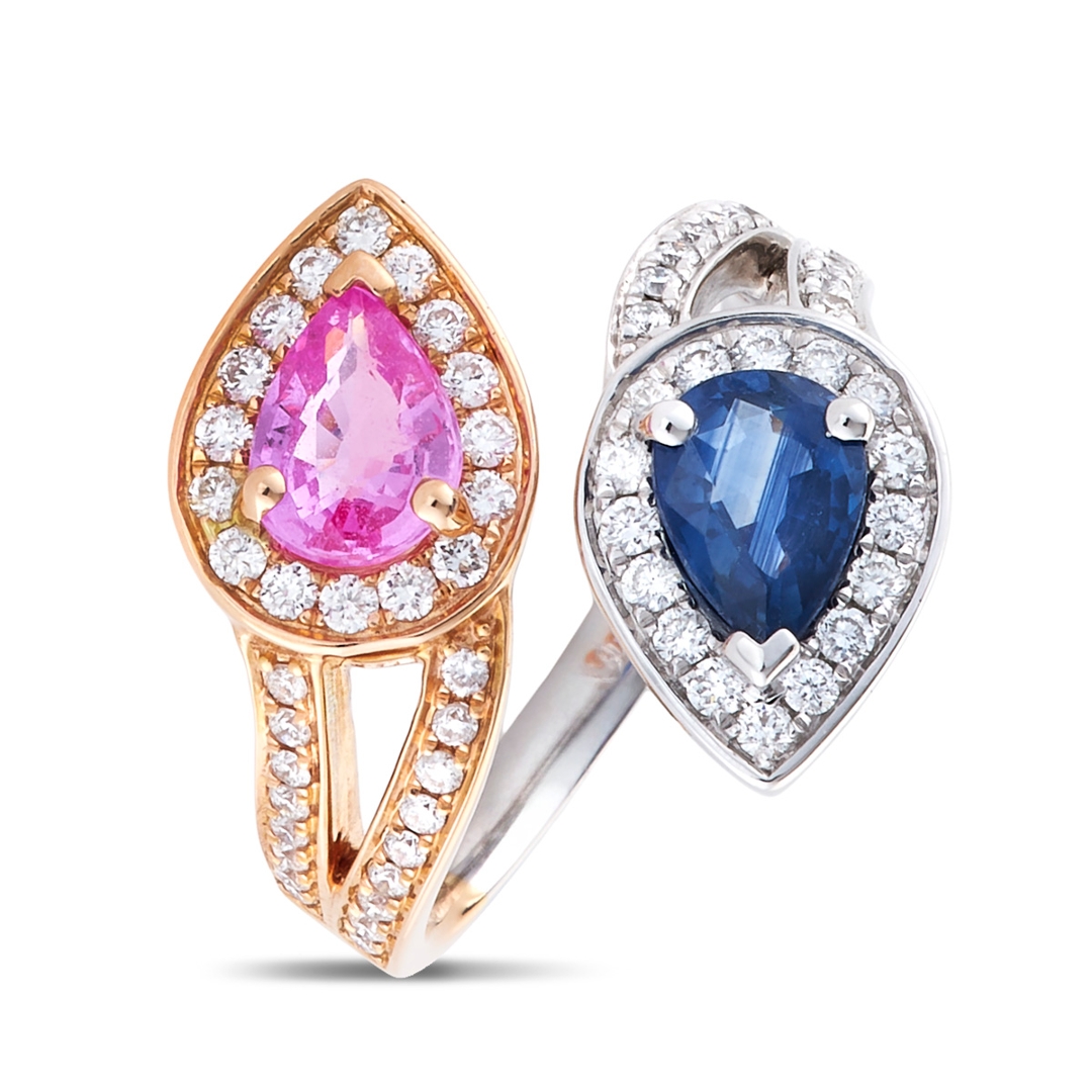 A brand-new, unused certified natural diamond and multi-sapphire toi et moi ring that showcases expressive colour, elegant symmetry and refined craftsmanship in a beautifully shaped pear-cut design. At its centre sit two pear-cut sapphires, each weighing 0.87ct, one displaying a bright, feminine pink and the other a rich, confident blue. Their mirrored placement creates a graceful sweep across the finger, allowing both stones to contrast and complement one another while producing smooth, lively flashes of colour as the light moves across their facets. This pairing gives the ring a striking yet harmonious character, offering a modern take on the classic toi et moi style.