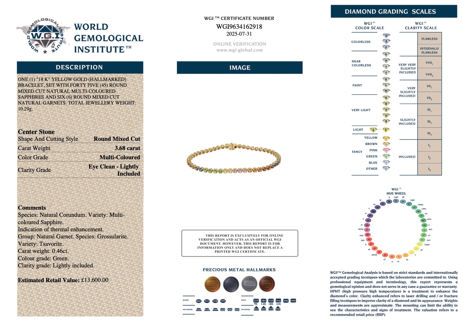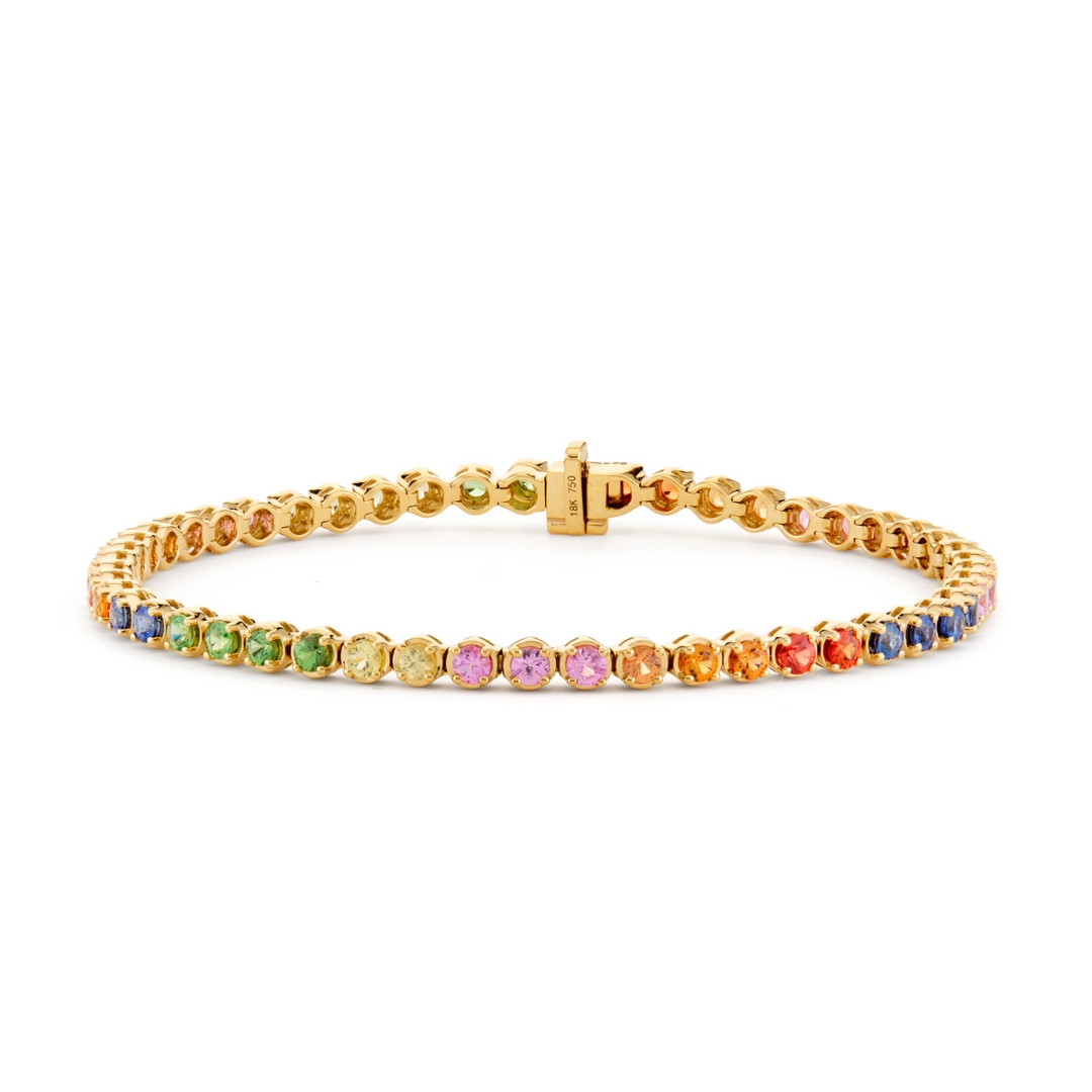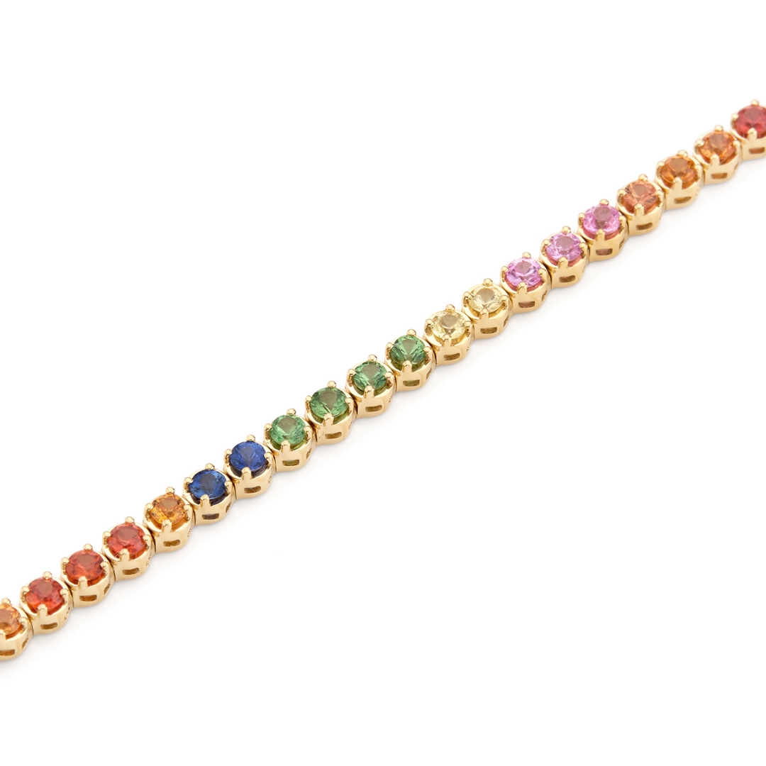 Expertly crafted in 18ct yellow gold, this 10.29-gram bracelet exudes warmth and refinement. The rich golden setting enhances the vibrancy of each gemstone, while the precise craftsmanship ensures both comfort and enduring quality. Every gemstone is carefully matched and set to achieve a perfect balance of radiance and sophistication, making this piece a valid showcase of fine jewellery artistry.