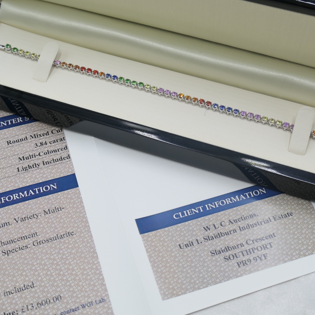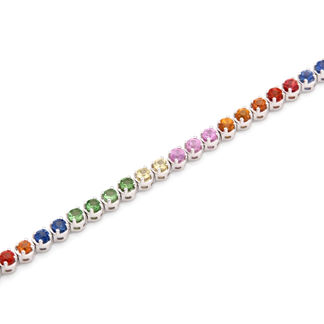 A brand-new, unused certified 18ct white gold bracelet, crafted in an elegant cluster design that brings together the vivid beauty of two exceptional gemstones. Set with 3.84ct of round, mixed-cut, multi-coloured sapphires, each stone has been carefully selected for its vibrant tone and brilliance, creating a lively and eye-catching display across the wrist. Interspersed among the sapphires are 0.42ct of round, mixed-cut, multi-coloured garnets, whose rich, warm shades add depth and contrast to the piece. The cool lustre of the white gold setting enhances the vibrancy of the gemstones, allowing their colours to shine with remarkable clarity.