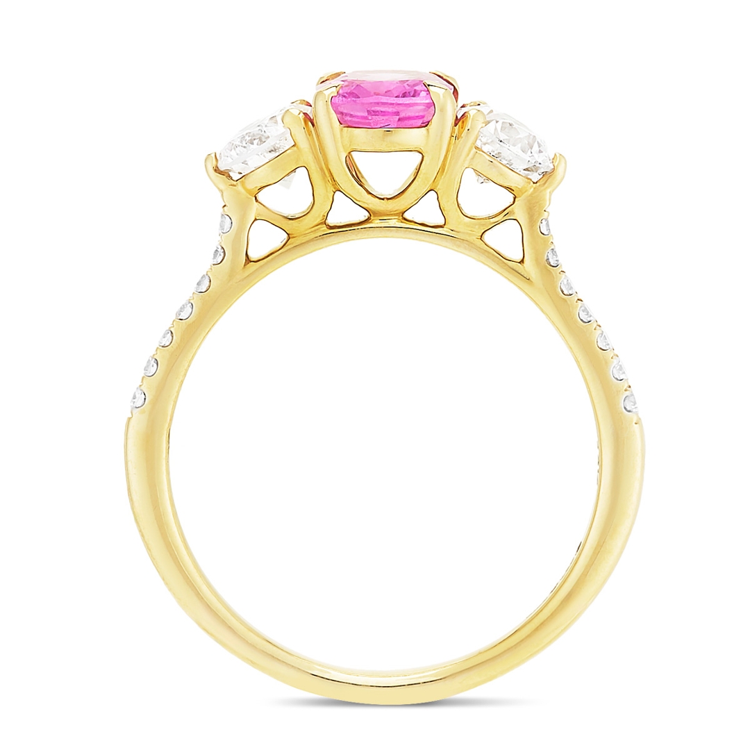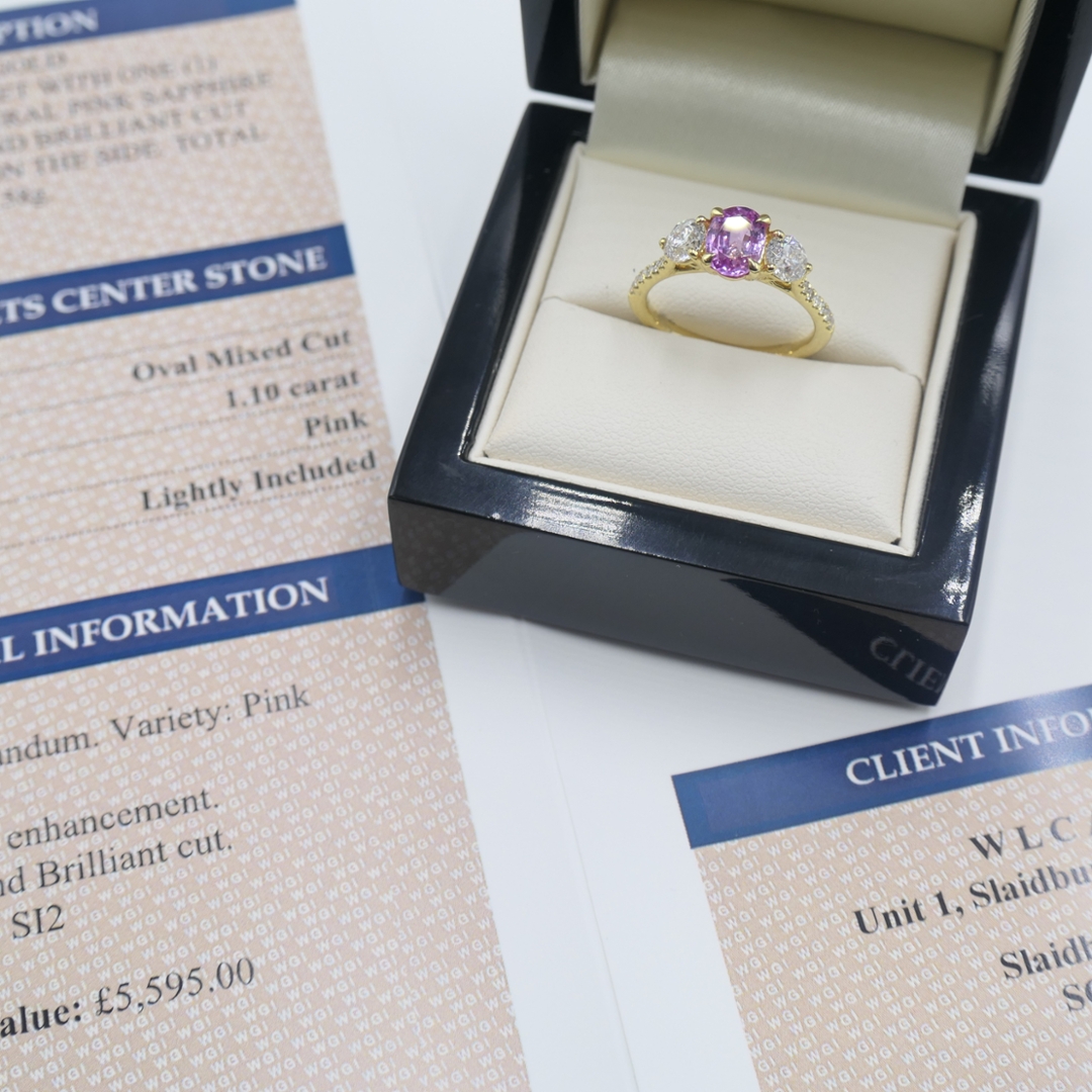 A brand-new, unused certified 18ct yellow gold three-stone cluster ring, combining the enchanting beauty of a natural pink sapphire with the brilliance of natural diamonds. At its centre lies a 1.10ct oval mixed-cut pink sapphire, radiating a delicate yet striking pink hue, celebrated for its rarity and romantic symbolism. Flanking the sapphire are two brilliant-cut diamonds, their fire and sparkle enhancing the gem’s allure, while a cluster of additional diamonds gracefully adorns the shoulders, ensuring light dances across the entire piece. With a total diamond weight of 0.96ct, each stone is graded F–G in colour and SI1–SI2 in clarity, creating a balance of beauty and value.