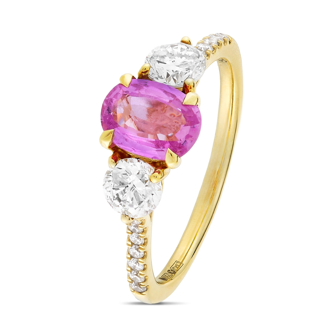 A brand new, unused, certified natural diamond & pink sapphire gemstone three-stone cluster ring, with one oval mixed-cut pink sapphire gemstone to the centre, two brilliant cut diamonds to the sides & a cluster of brilliant-cut diamonds to the shoulders, set in 18ct yellow gold.
