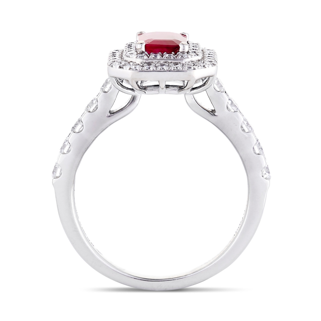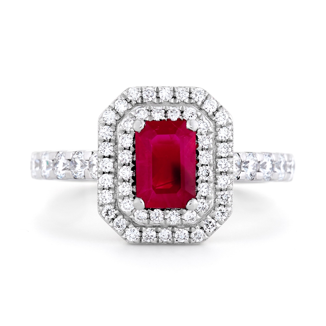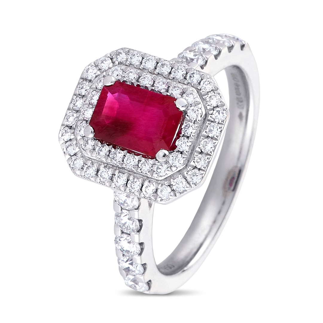 A brand-new, unused, certified natural diamond & ruby gemstone cluster ring, set with one octagonal step-cut ruby gemstone to the centre & a cluster of brilliant-cut diamonds in a double-halo setting & to the shoulders, set in platinum.