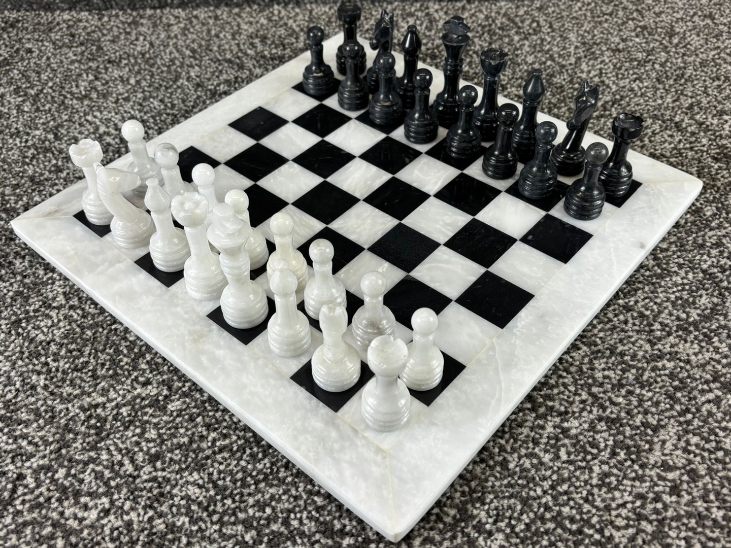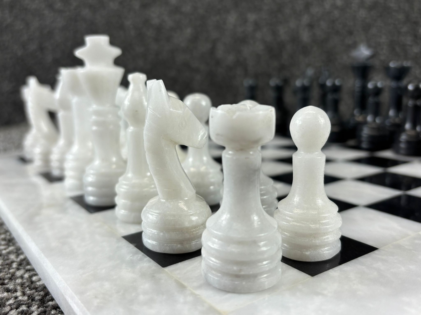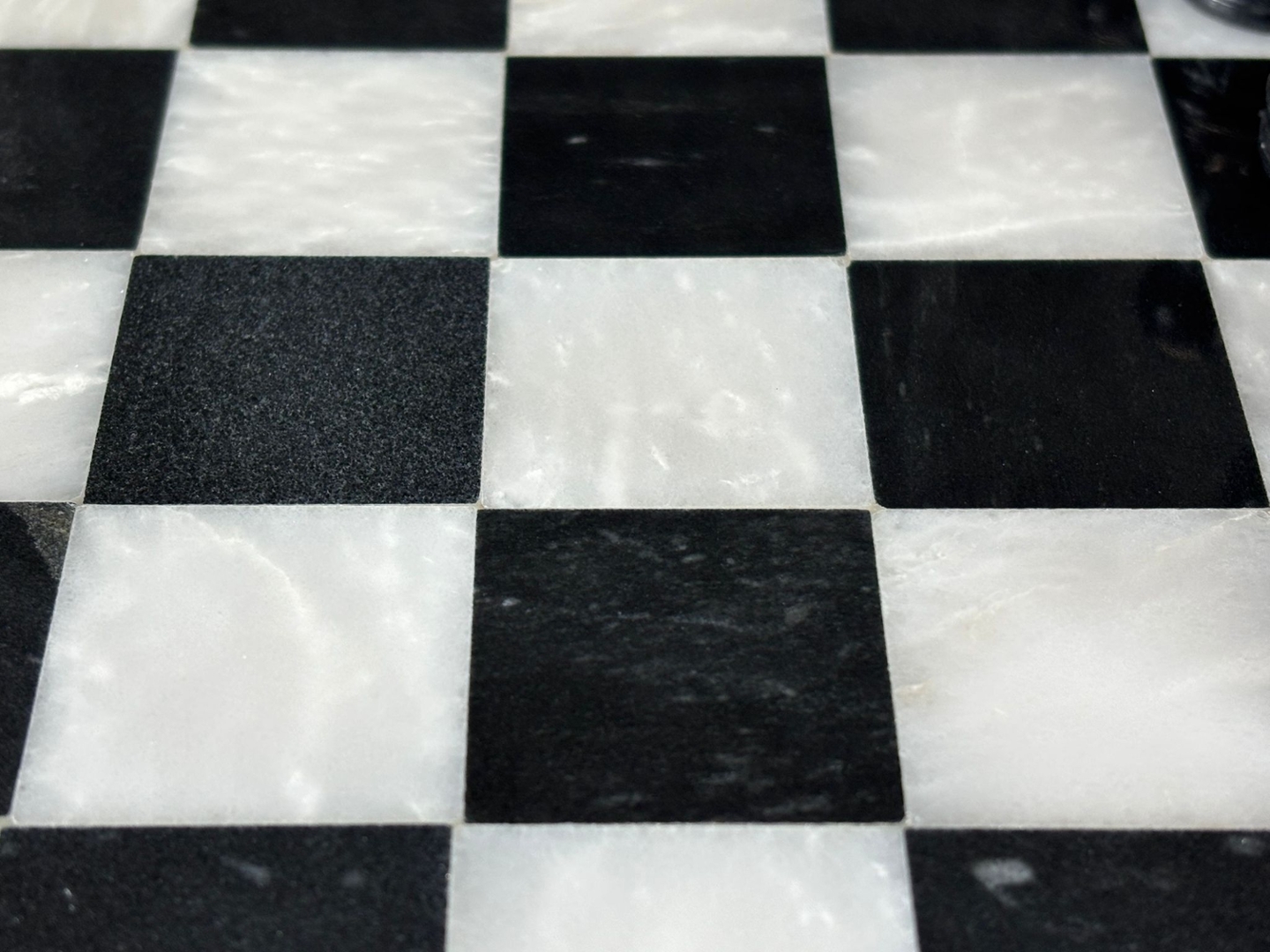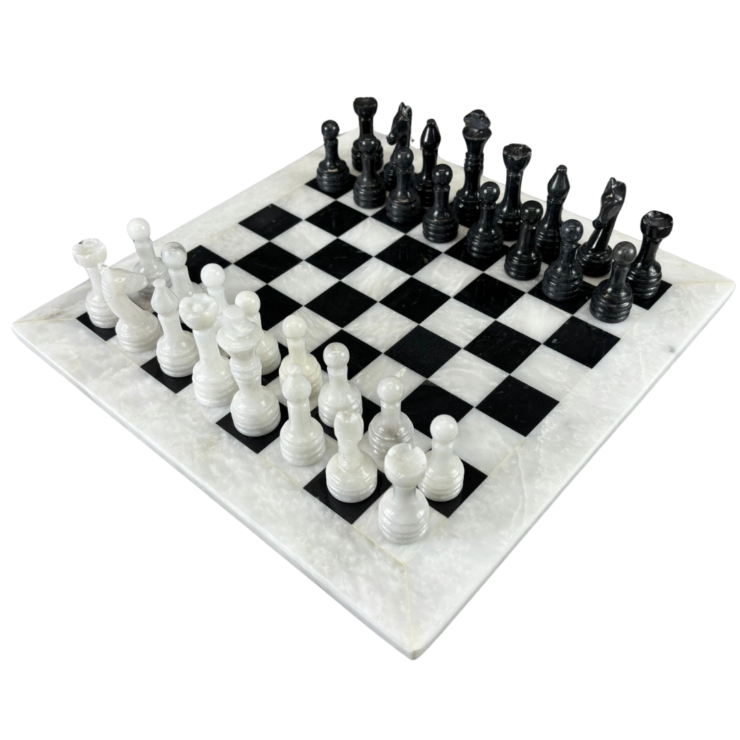 A black and white hand carved marble chess set that brings together timeless design and fine craftsmanship. Each piece is meticulously crafted from natural marble, resulting in a smooth finish with elegant details that make every move feel refined. The contrasting black and white tones add a striking visual appeal, while the weight of the marble gives the set a solid, luxurious presence. Measuring approximately 12 inches by 12 inches, it is an ideal size for both play and display.